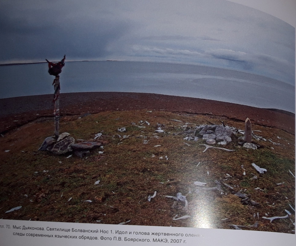 "31 мая я с проводником моим Ячей был на северо-восточной оконечности о.Вайгача, называемой Болванским Носом. Здесь находится священное место самоедов; вот почему этот мыс и получил такое название. В настоящее время это место ничего особенного не представляет, почти все предметы приношений растасканы частыми посетителями-промышленниками."