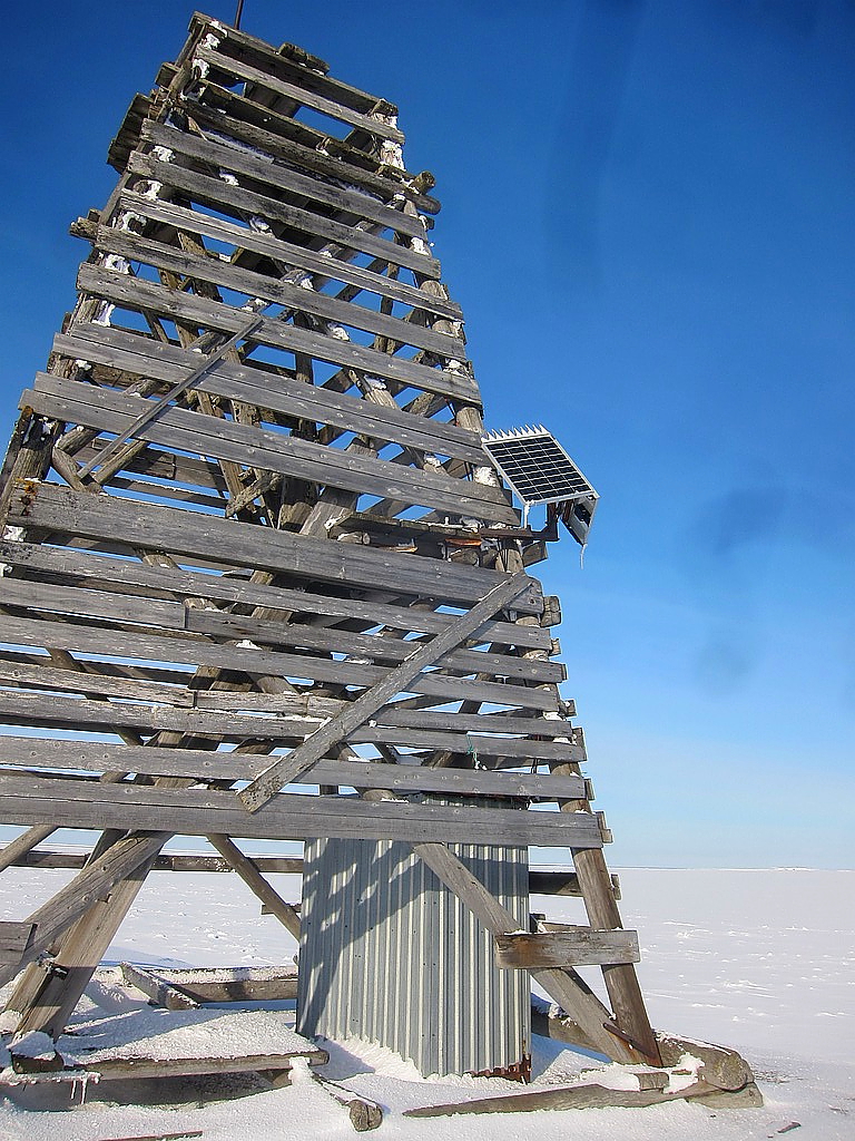 Поднявшись на середину и уцепившись за балку, осмотрелся. Со всех сторон меня окружало открытое море с белыми приподнятыми грядами торосов, а с северной стороны высился кубик еще одного маяка.