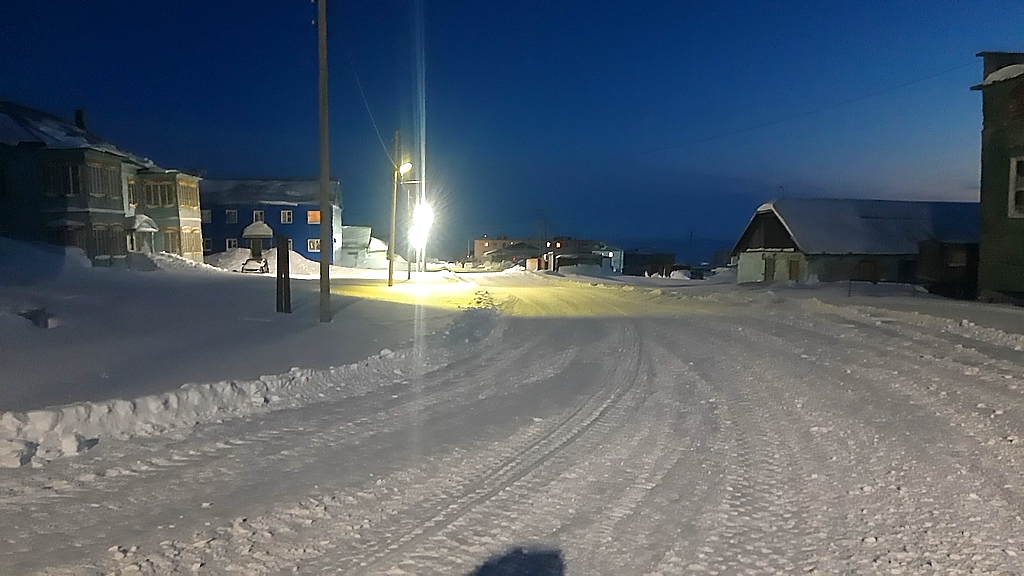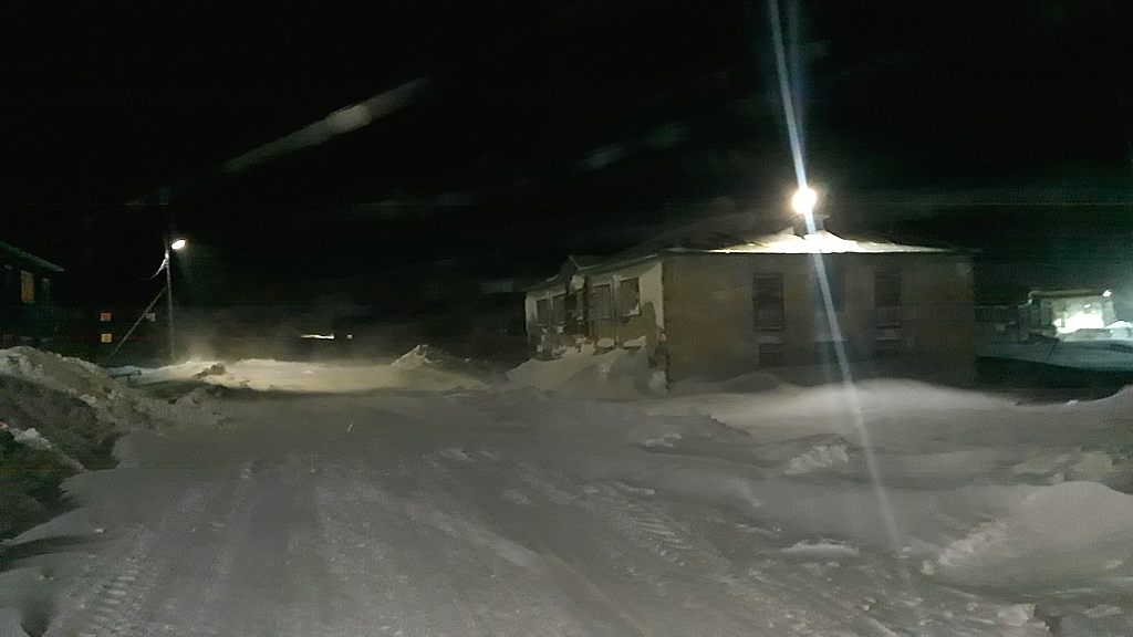 Амдерма вечерняя после прилета спокойна и тиха. Минус 12. Идем с Иваном Петровичем проведать Северок. Очень рад увидеть на улице знакомые лица амдерминцев.