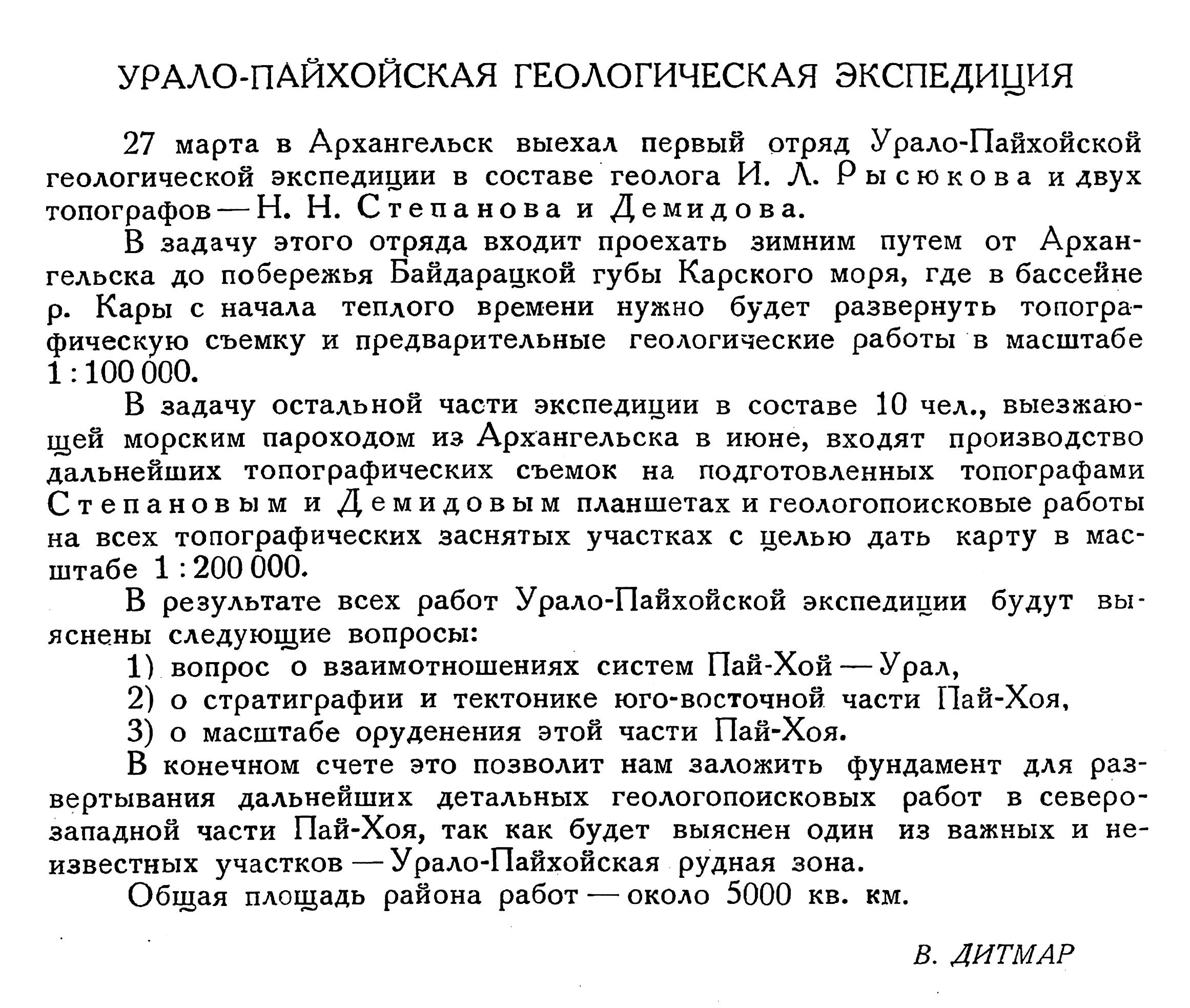 В конце марта, еще зимним путем были отправлены к месту работ два топографа и геолог для разбивки геодезической сети. 6 июля из Архангельска к устью Кары выехал и остальной состав экспедиции в количестве 13 человек. Тяжелые ледовые условия задержали прибытие экспедиции к месту работ, поэтому последний отряд развернул свои работы в начале августа. В распоряжении экспедиции имелась моторная лодка и 350 оленей с нартами, обслуживаемых 10 пастухами. Экспедиция произвела съемочные топографические и геологические работы на площади в 5000 кв. км тремя отрядами. Северный отряд (нач.