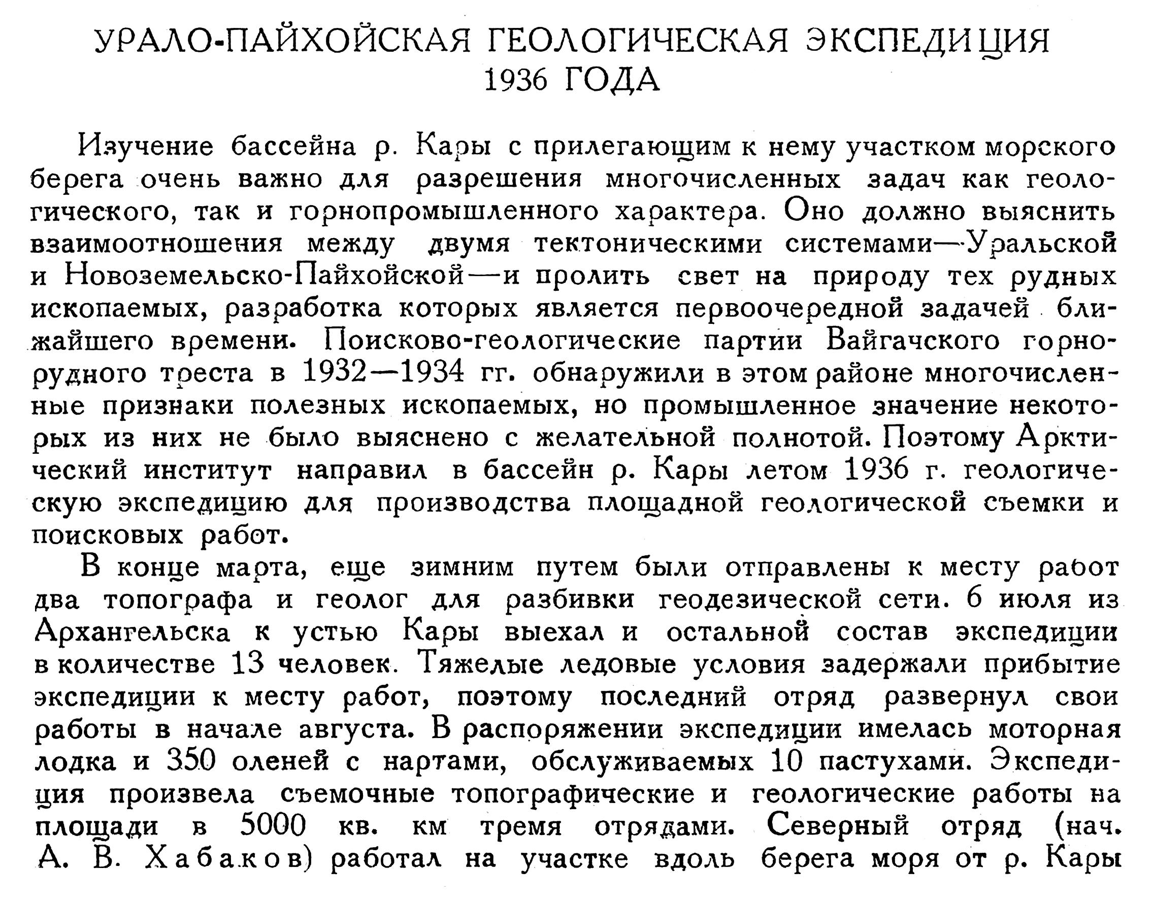 Изучение бассейна р. Кары с прилегающим к нему участком морского берега очень важно для разрешения многочисленных задач как геологического, так и горнопромышленного характера. Оно должно выяснить взаимоотношения между двумя тектоническими системами — Уральской и Новоземельско-Пайхойской — и пролить свет на природу тех рудных ископаемых, разработка которых является первоочередной задачей ближайшего времени. Поисково-геологические партии Вайгачского горнорудного треста в 1932—1934 гг. обнаружили в этом районе многочисленные признаки полезных ископаемых, но промышленное значение некоторых из них не было выяснено с желательной полнотой. Поэтому Арктический институт направил в бассейн р. Кары летом 1936 г. геологическую экспедицию для производства площадной геологической съемки и поисковых работ.