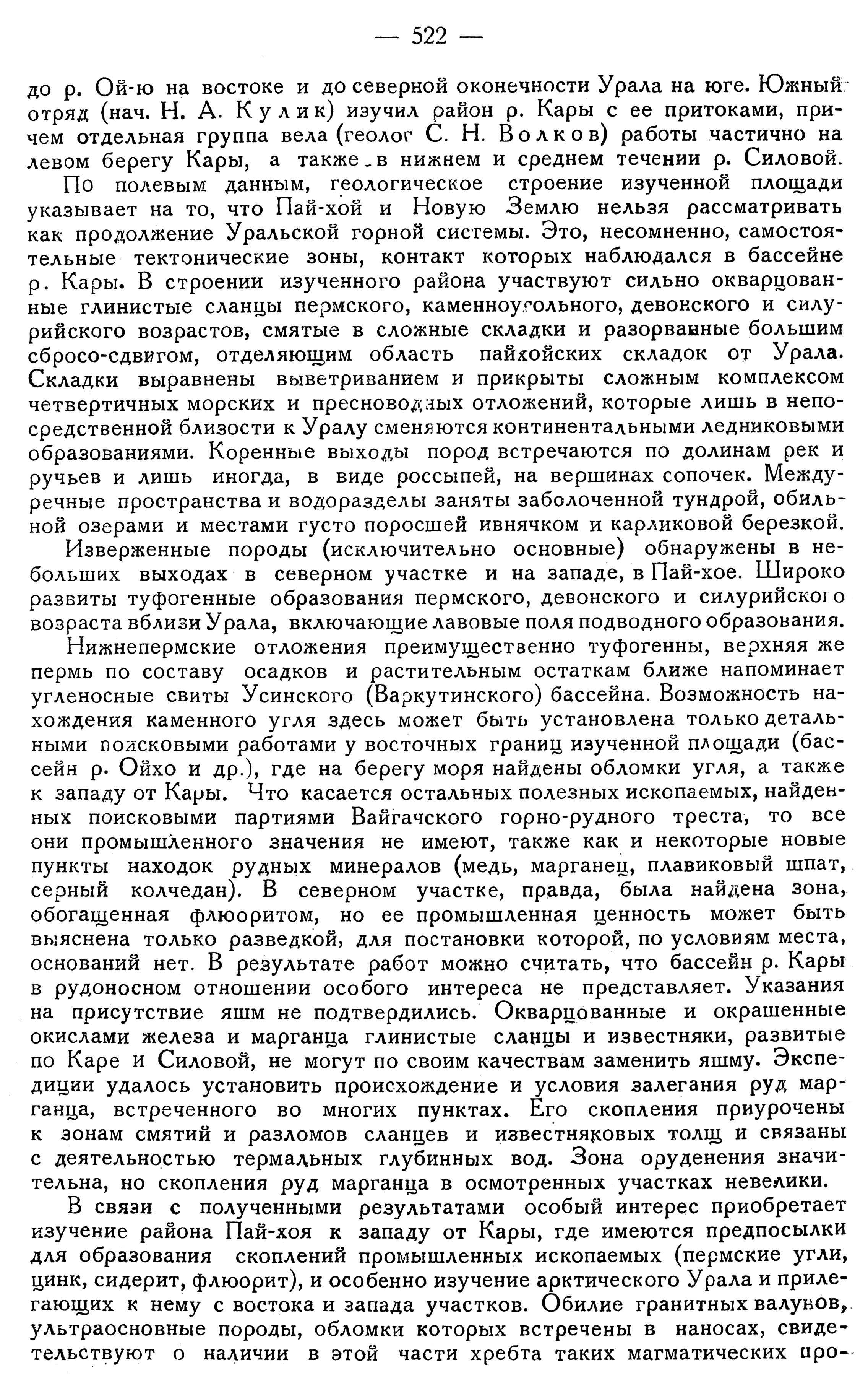 В связи с полученными результатами особый интерес приобретает изучение района Пай-хоя к западу от Кары, где имеются предпосылки для образования скоплений промышленных ископаемых (пермские угли, цинк, сидерит, флюорит), и особенно изучение арктического Урала и прилегающих к нему с востока и запада участков. Обилие гранитных валунов, ультраосновные породы, обломки которых встречены в наносах, свидетельствуют о наличии в этой части хребта таких магматических про-
