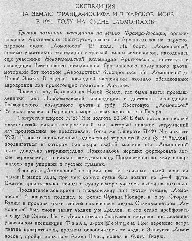 ЭКСПЕДИЦИЯ НА ЗЕМЛЮ ФРАНЦА-ИОСИФА И В КАРСКОЕ МОРЕ В 1931 ГОДУ НА СУДНЕ „ЛОМОНОСОВ"