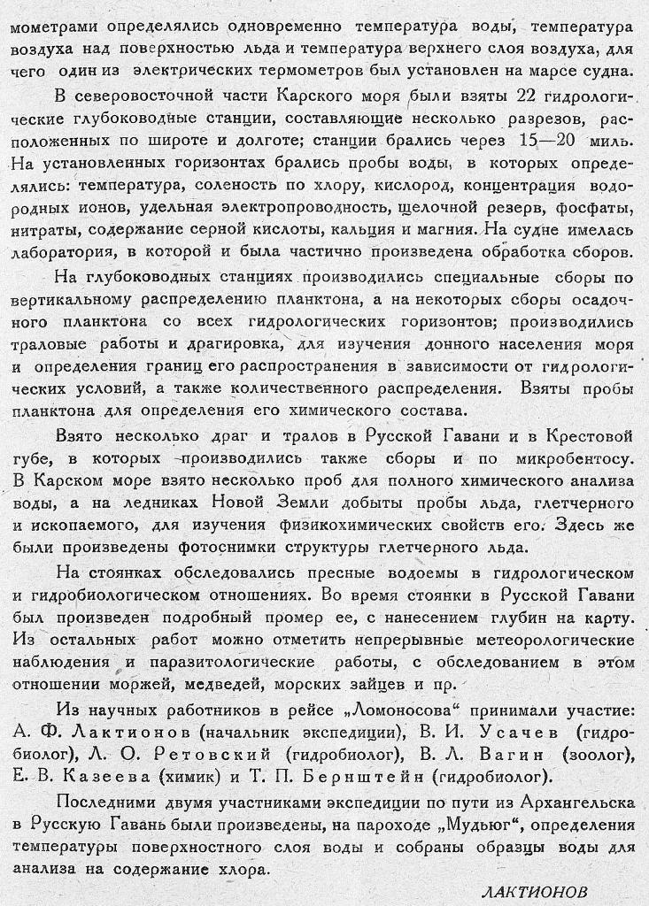 Из научных работников в рейсе „Ломоносова" принимали участие: А. Ф. Лактионов (начальник экспедиции), В. И. Усачев (гидробиолог), Л. О. Ретовский (гидробиолог), В. Л. Вагин (зоолог), Е. В. Казеева (химик) и Т. П. Бернштейн (гидробиолог).