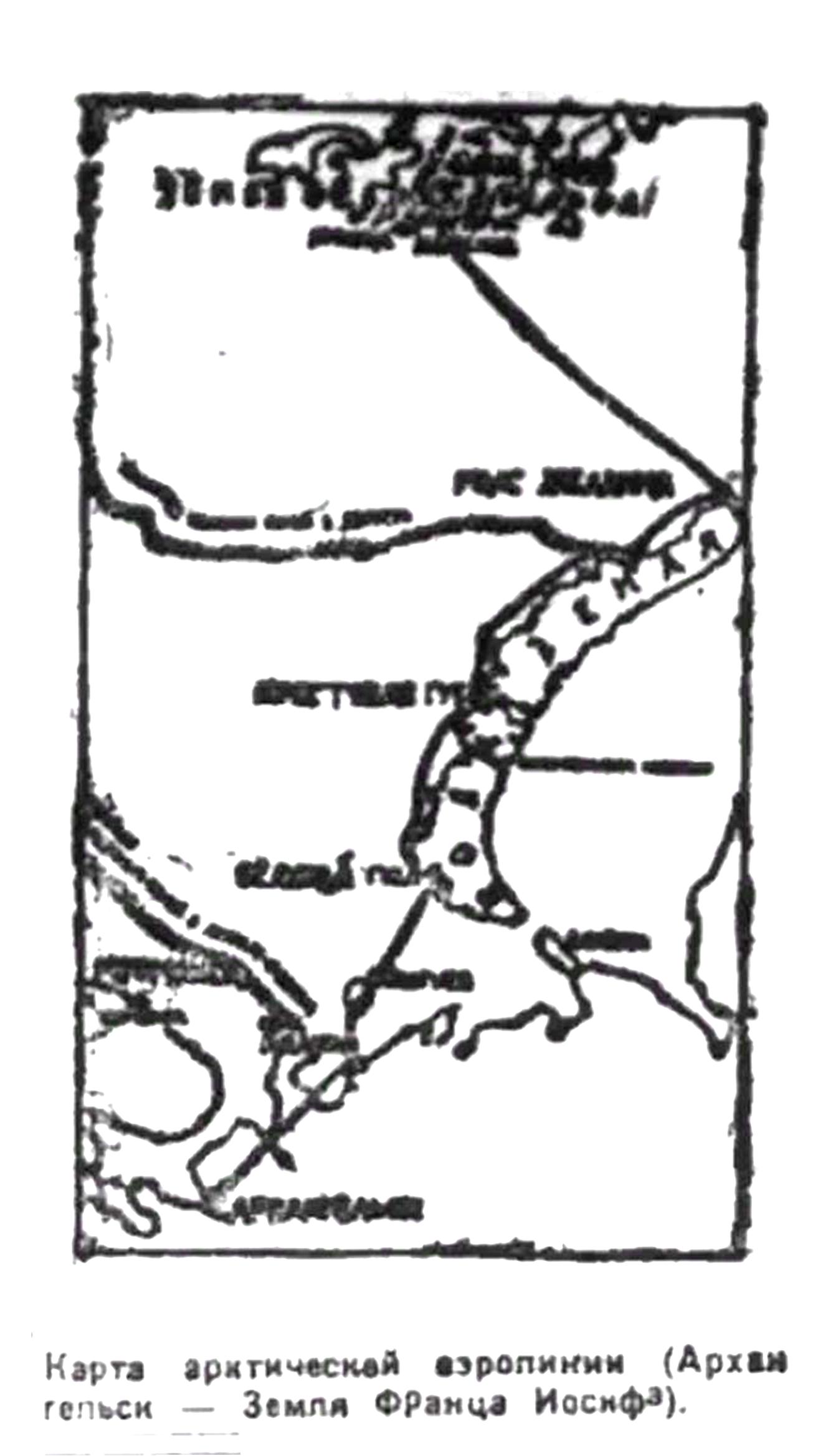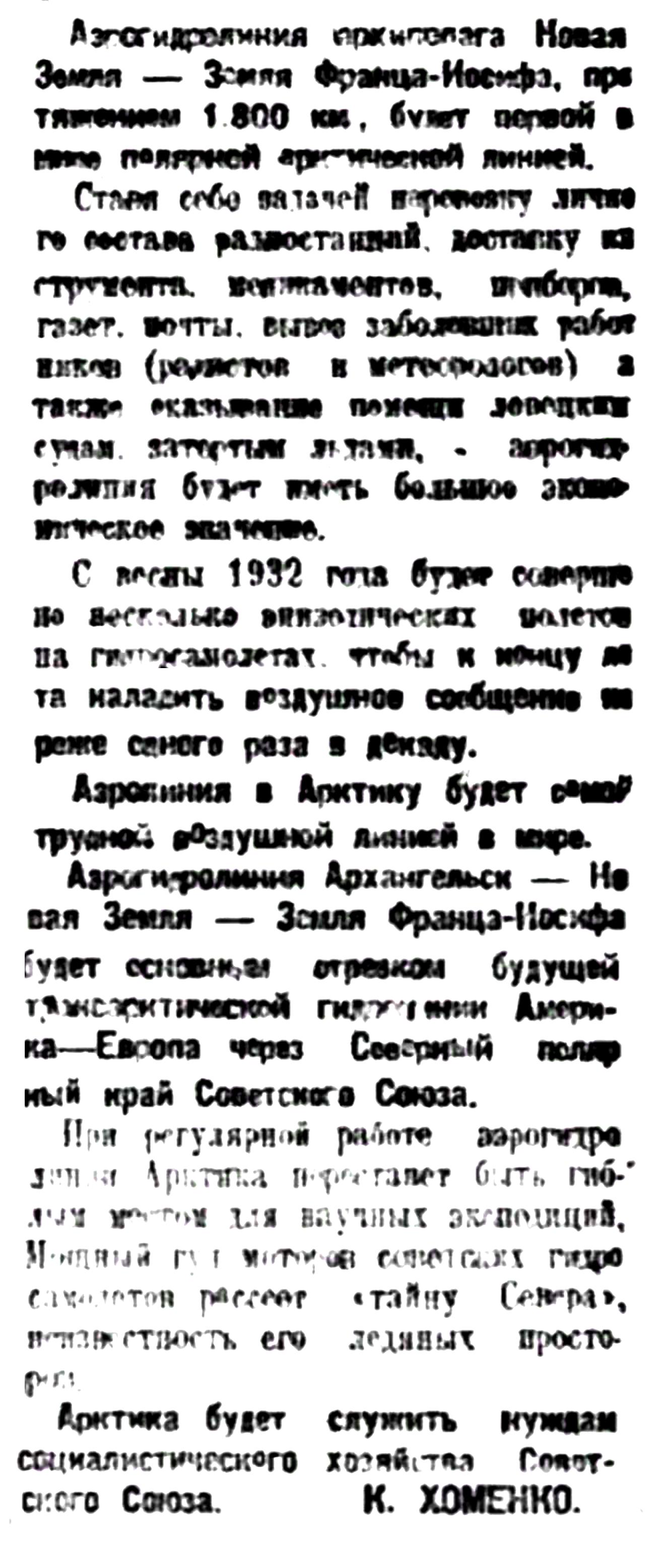 Аэрогидролиния архипелага Новая Земля — Земля Франца-Иосифа, протяжением 1 800 км., будет первой в мире полярной арктической линией. Ставя себе задачей перевозку личного состава радиостанций, доставку инструмента, медикаментов, приборов, газет, почты, вывоз заболевших работников (радистов и метеорологов) а также оказание помощи ловецким судам, затертым льдами, - аэрогидролиния будет иметь большое экономическое значение. С весны 1932 года будет совершено несколько эпизодических полетов на гидросамолетах, чтобы к концу лета наладить воздушное сообщение не реже одного раза в декаду.