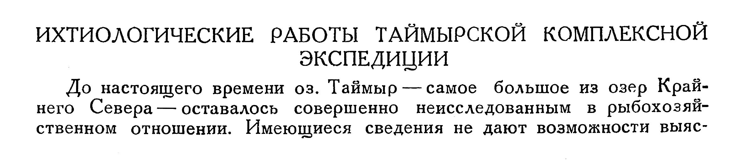 Ввиду того что этот район совершенно не охвачен исследованиями рыбопромыслового и промыслово-охотничьего характера и не освещен в геоботаническом отношении, в программу работ включено освоение озера Таймыр и прилегающего к нему района в рыбопромысловом, промыслово-охотничьем и геоботаническом отношениях с целью выяснения производительных сил района и путей их промысловой эксплоатации.