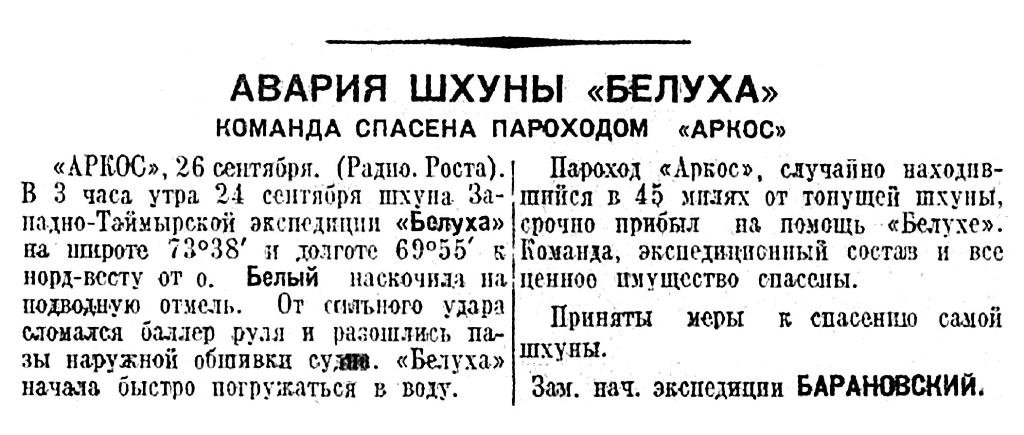 «АРКОС», 26 сентября. (Радио. Роста). В 3 часа утра 24 сентября шхуна Западно-Таймырской экспедиции «Белуха» на широте 73°38' и долготе 69°55' к норд-весту от о. Белый наскочила на подводную отмель. От сильного удара сломался баллер руля и разошлось пазы наружной обшивки судна. «Белуха» начала быстро погружаться в воду.