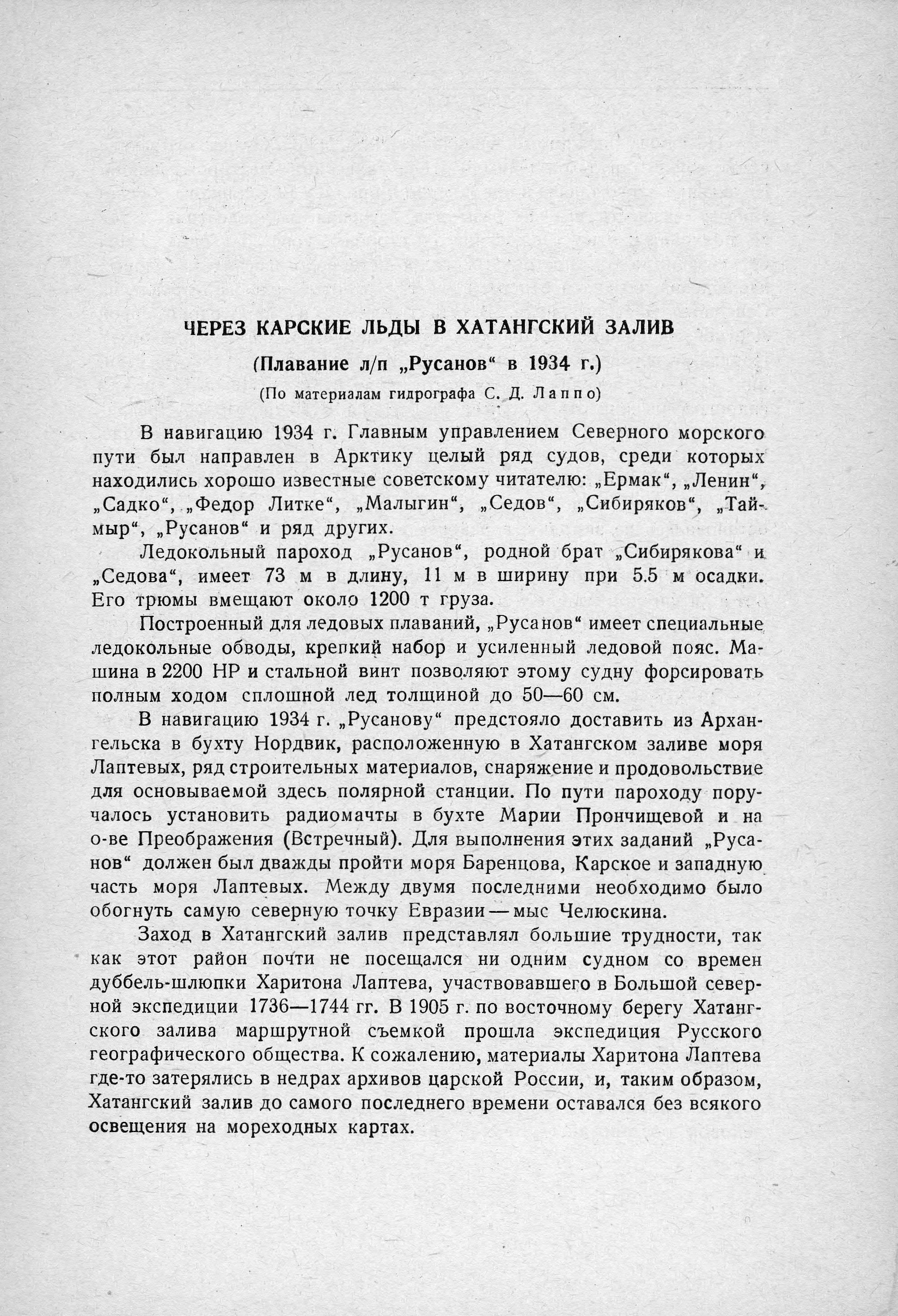 Плавание л/п „Русанов" в 1934 г. (По материалам гидрографа С. Д. Лаппо)