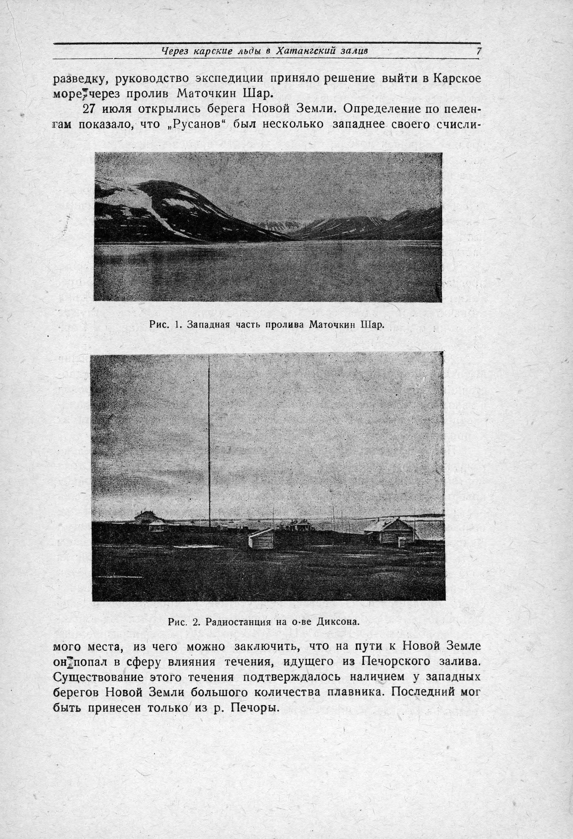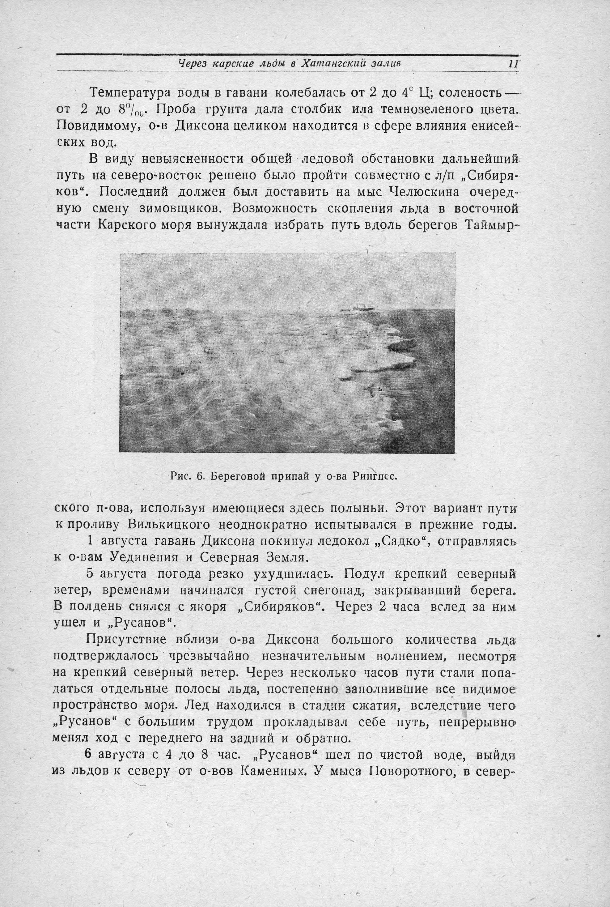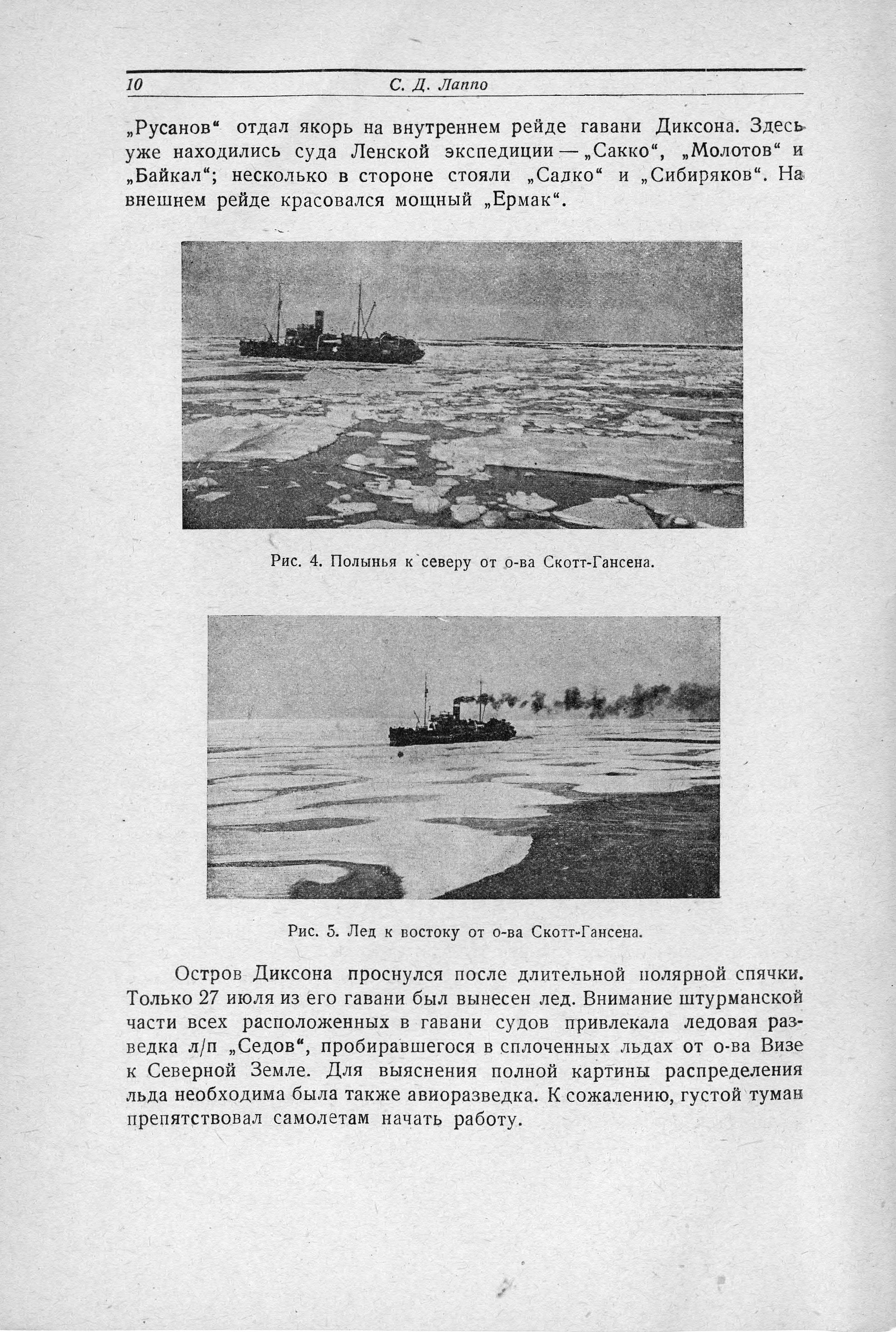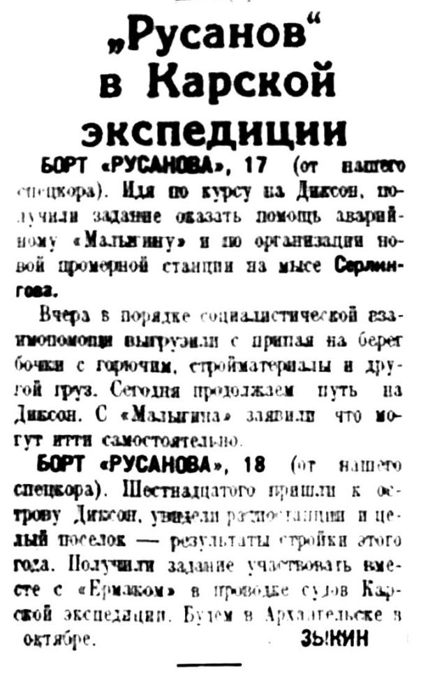 Покрытые снегом горы Новой Земли были видны долго, почти до 8 часов вечера, причем со стороны Карского моря они выглядели красивее и величественнее, чем со стороны Баренцева. 30 июля «Русанов» пришел на Диксон, где на рейде уже стояли ледокол «Ермак», ледокольные пароходы «Садко» и «Сибиряков» и три парохода - «Молотов», «Байкал» и «Сакко», а в бухте работало гидрографическое судно «Циркуль». Весь караван стоял на Диксоне в ожидании авиационной ледовой разведки, которая из-за неблагоприятных погодных условий на востоке Карского моря задерживалась. На Диксоне «Русанов» простоял до 5 августа. В ночь на второе ушел в море «Садко», а утром - «Ермак»...».
