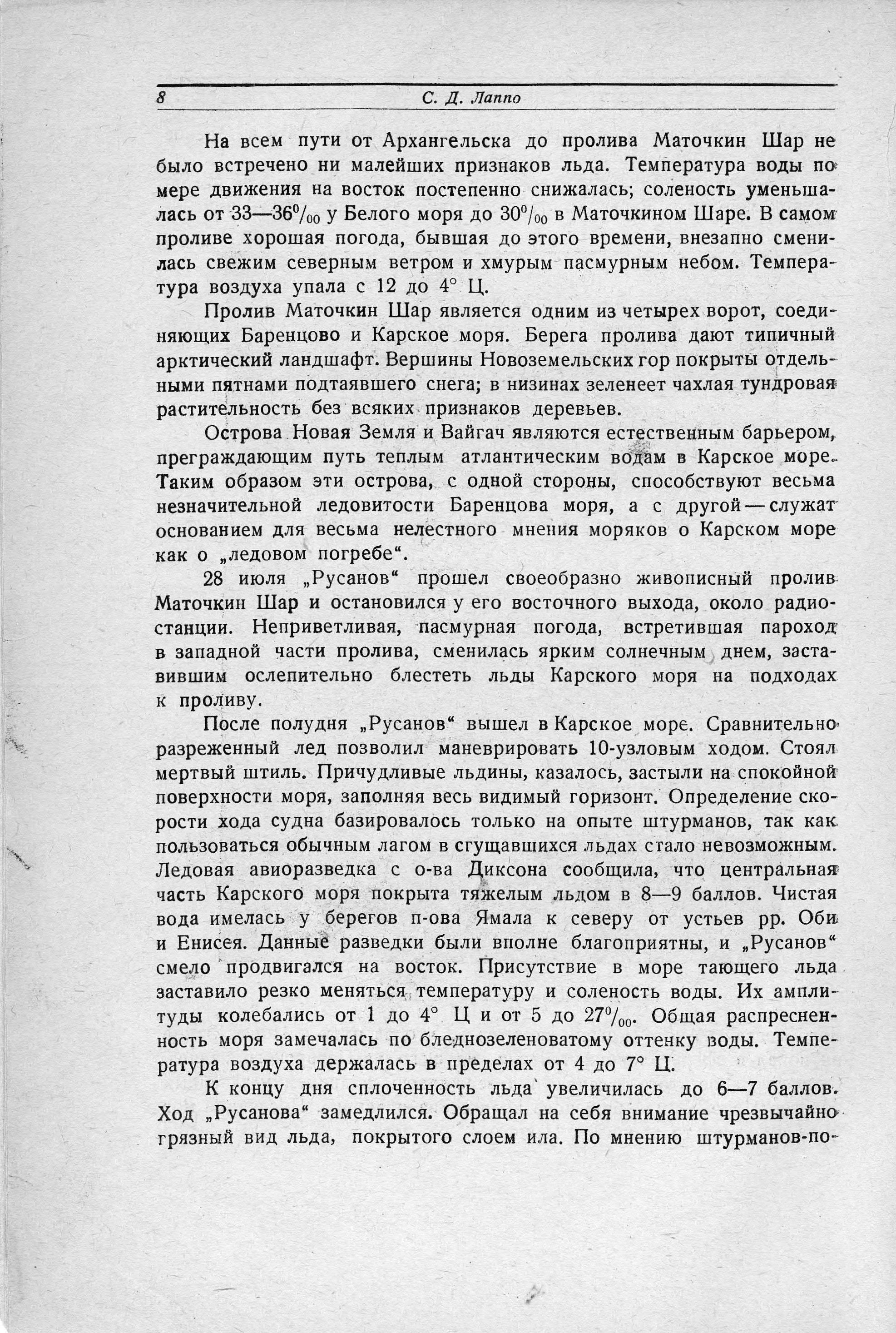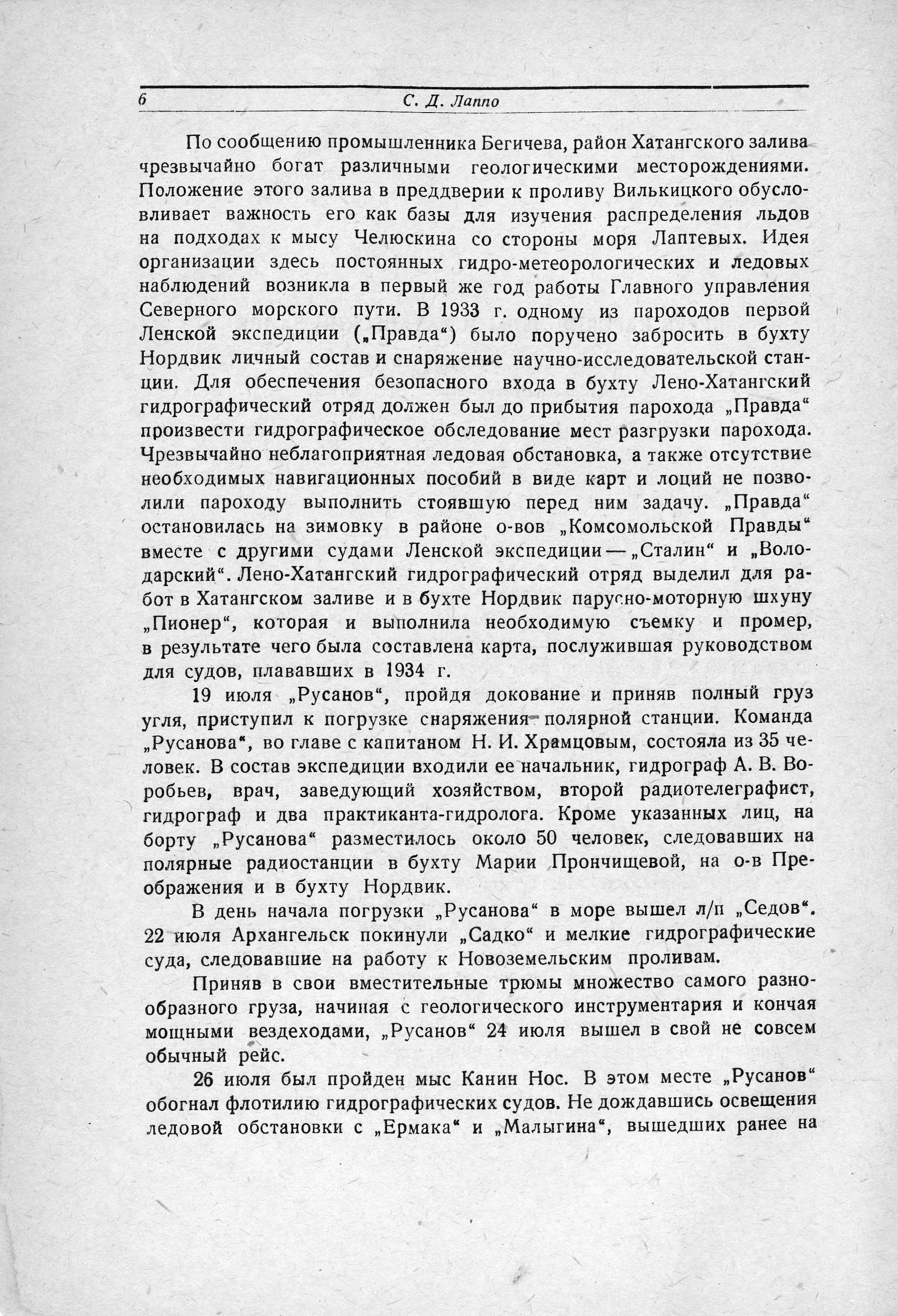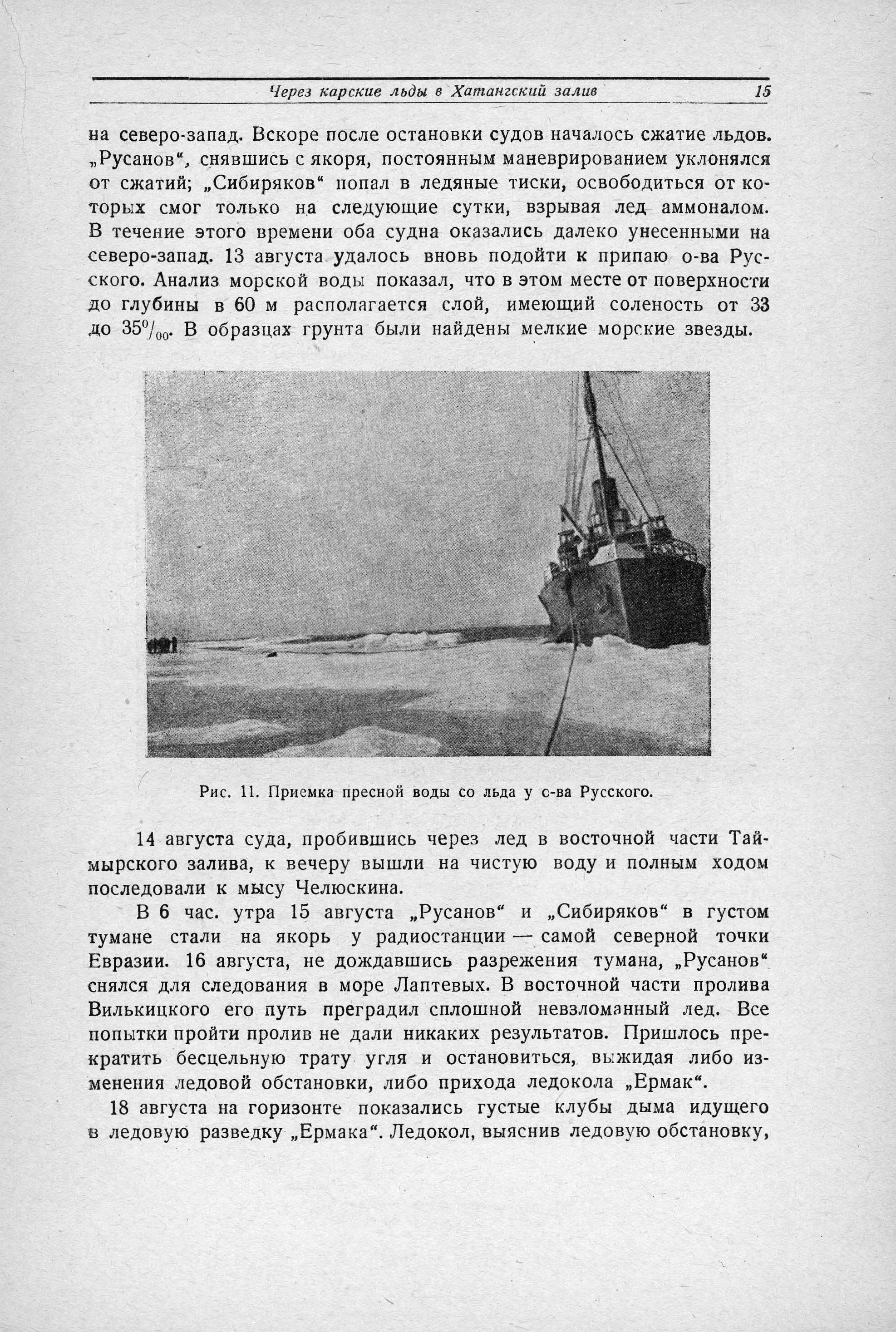 Покрытые снегом горы Новой Земли были видны долго, почти до 8 часов вечера, причем со стороны Карского моря они выглядели красивее и величественнее, чем со стороны Баренцева. 30 июля «Русанов» пришел на Диксон, где на рейде уже стояли ледокол «Ермак», ледокольные пароходы «Садко» и «Сибиряков» и три парохода - «Молотов», «Байкал» и «Сакко», а в бухте работало гидрографическое судно «Циркуль». Весь караван стоял на Диксоне в ожидании авиационной ледовой разведки, которая из-за неблагоприятных погодных условий на востоке Карского моря задерживалась. На Диксоне «Русанов» простоял до 5 августа. В ночь на второе ушел в море «Садко», а утром - «Ермак»...».