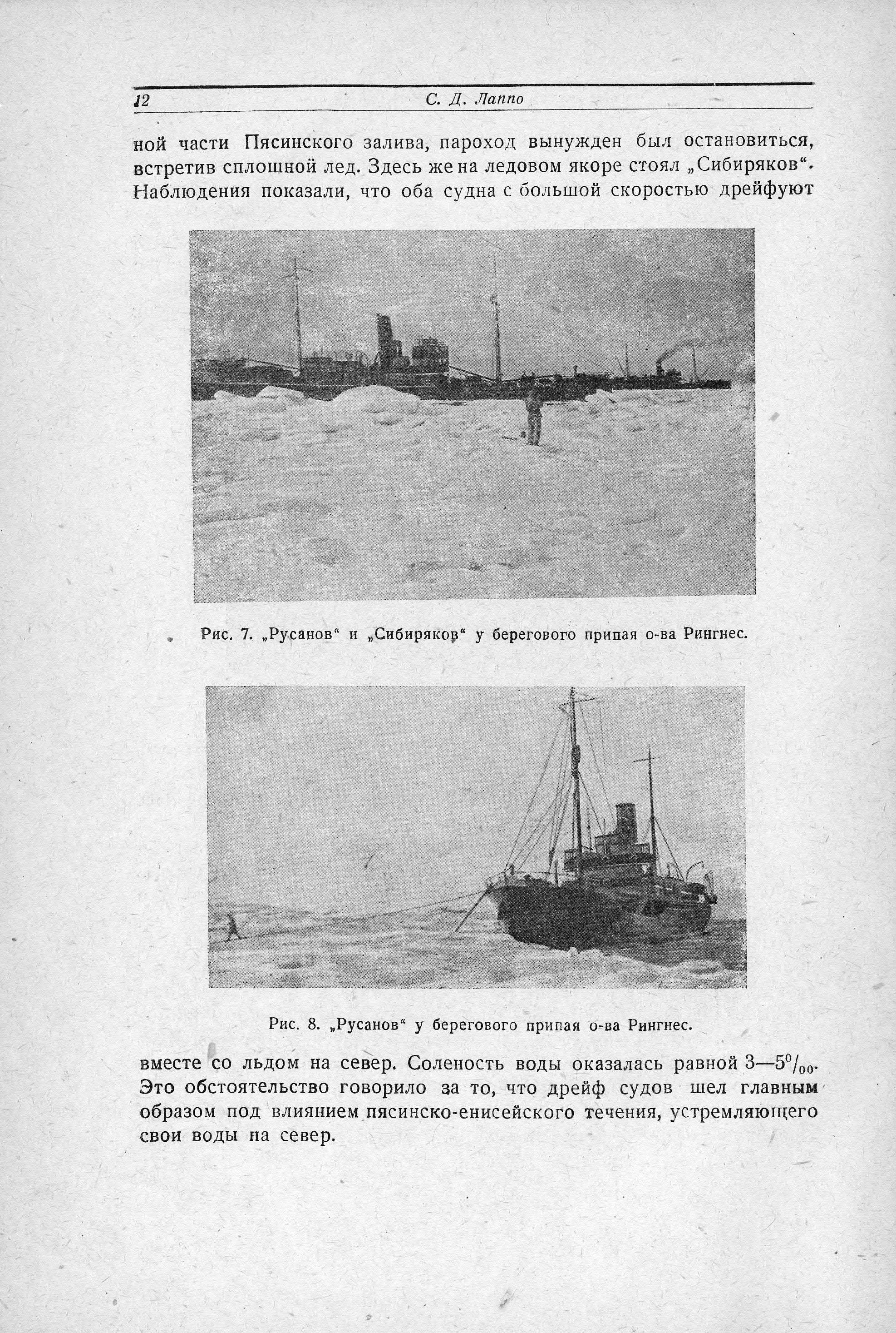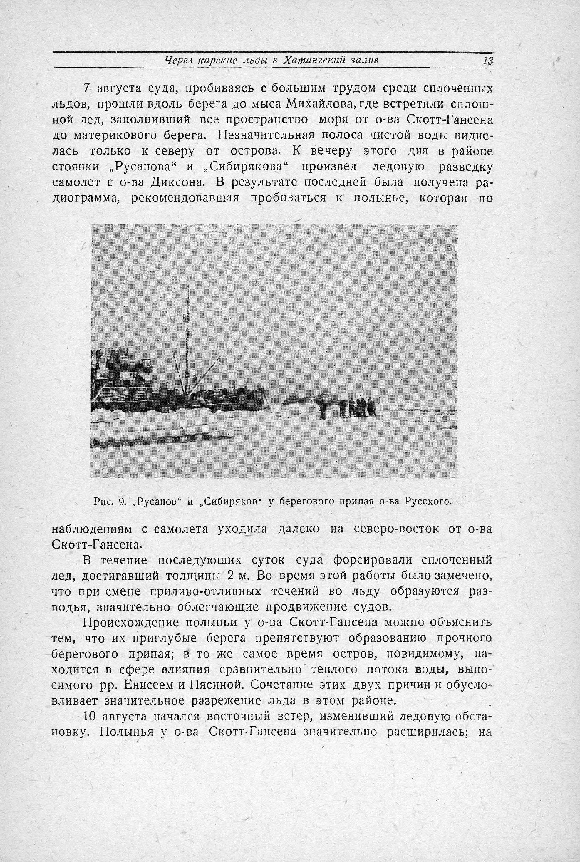 7 августа суда, пробиваясь с большим трудом среди сплоченных льдов, прошли вдоль берега до мыса Михайлова, где встретили сплошной лед, заполнивший все пространство моря от о-ва Скотт-Гансена до материкового берега. Незначительная полоса чистой воды виднелась только к северу от острова. К вечеру этого дня в районе стоянки „Русанова" и „Сибирякова“ произвел ледовую разведку самолет с о-ва Диксона. В результате последней была получена радиограмма, рекомендовавшая пробиваться к полынье, которая по наблюдениям с самолета уходила далеко на северо-восток от о-ва Скотт-Гансена.