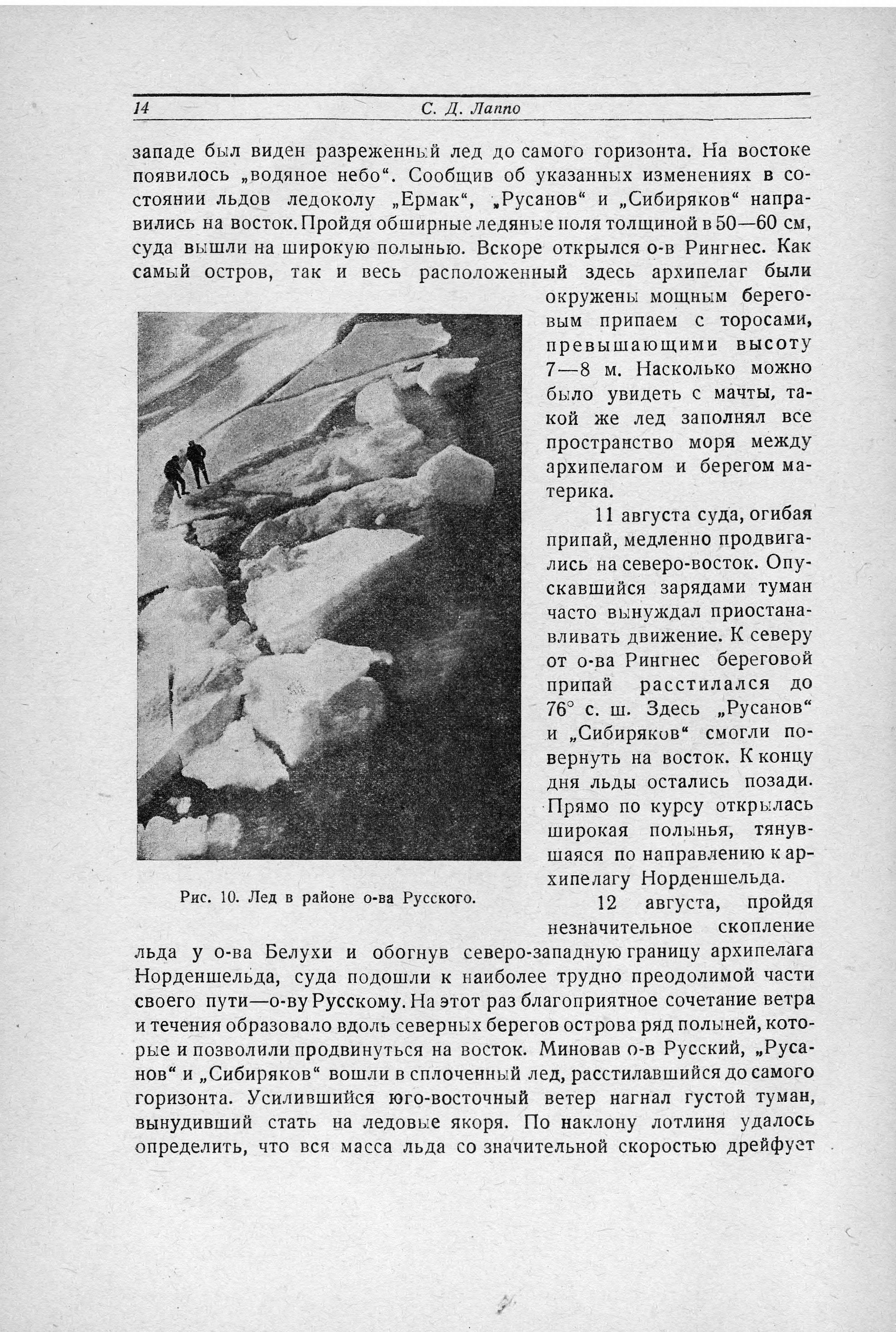 10 августа начался восточный ветер, изменивший ледовую обстановку. Полынья у о-ва Скотт-Гансена значительно расширилась; на западе был виден разреженный лед до самого горизонта. На востоке появилось „водяное небо". Сообщив об указанных изменениях в состоянии льдов ледоколу „Ермак",. Русанов" и „Сибиряков"
