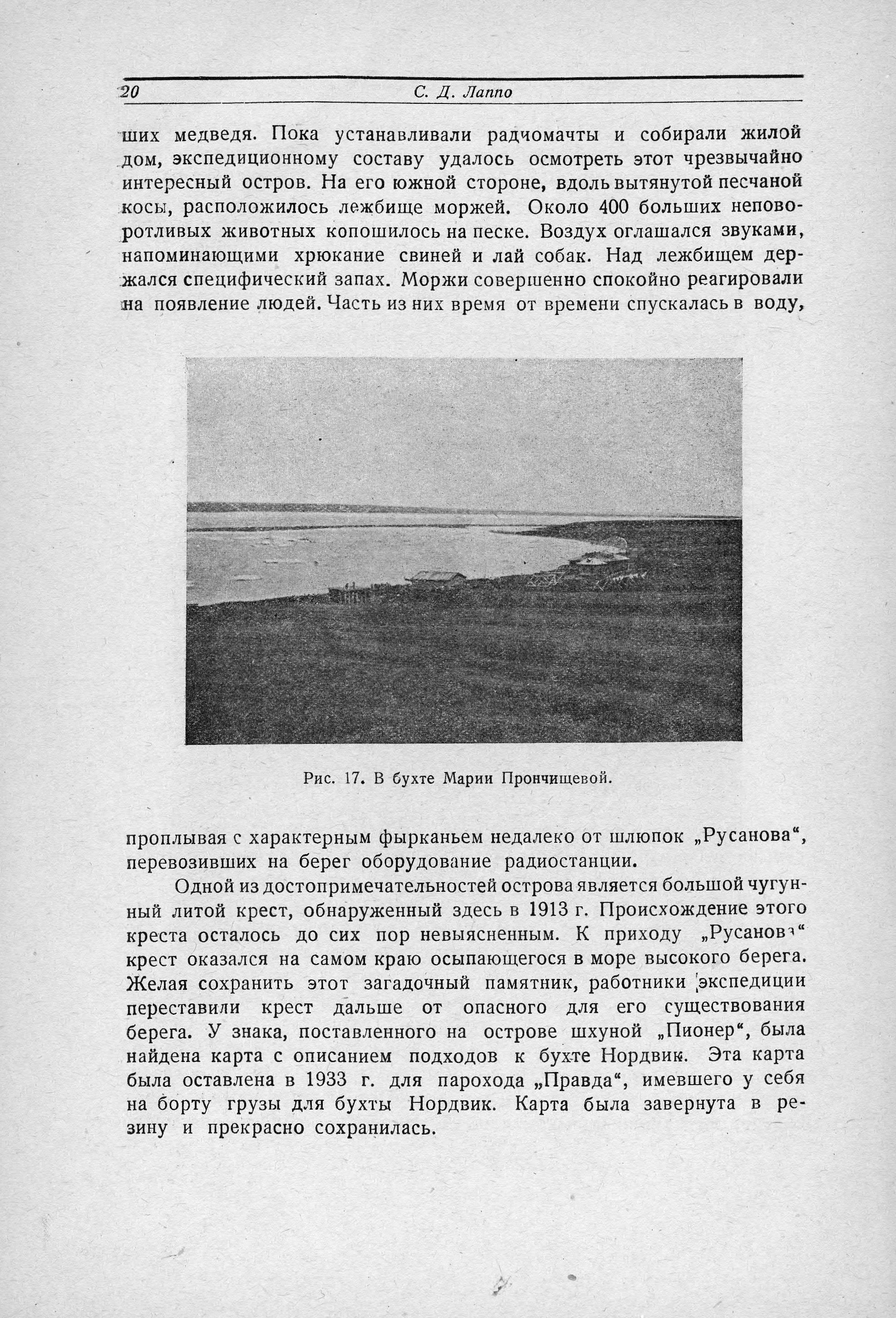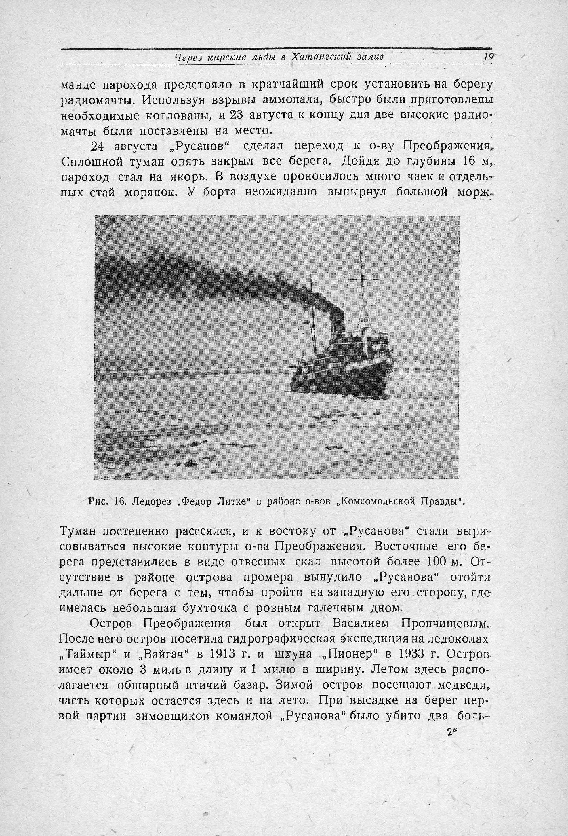 Остров Преображения был открыт Василием Прончищевым. После него остров посетила гидрографическая экспедиция на ледоколах „Таймыр" и „Вайгач" в 1913 г. и шхуна „Пионер" в 1933 г. Остров имеет около 3 миль в длину и 1 милю в ширину. Летом здесь располагается обширный птичий базар. Зимой остров посещают медведи, часть которых остается здесь и на лето. При высадке на берег первой партии зимовщиков командой „Русанова" было убито два больших медведя. Пока станавливали радиомачты и собирали жилой дом, экспедиционному составу удалось осмотреть этот чрезвычайно интересный остров. На его южной стороне, вдоль вытянутой песчаной косы, расположилось лежбище моржей. Около 400 больших неповоротливых животных копошилось на песке. Воздух оглашался звуками, напоминающими хрюкание свиней и лай собак. Над лежбищем держался специфический запах. Моржи совершенно спокойно реагировали на появление людей. Часть из них время от времени спускалась в воду, проплывая с характерным фырканьем недалеко от шлюпок „Русанова", перевозивших на берег оборудование радиостанции.