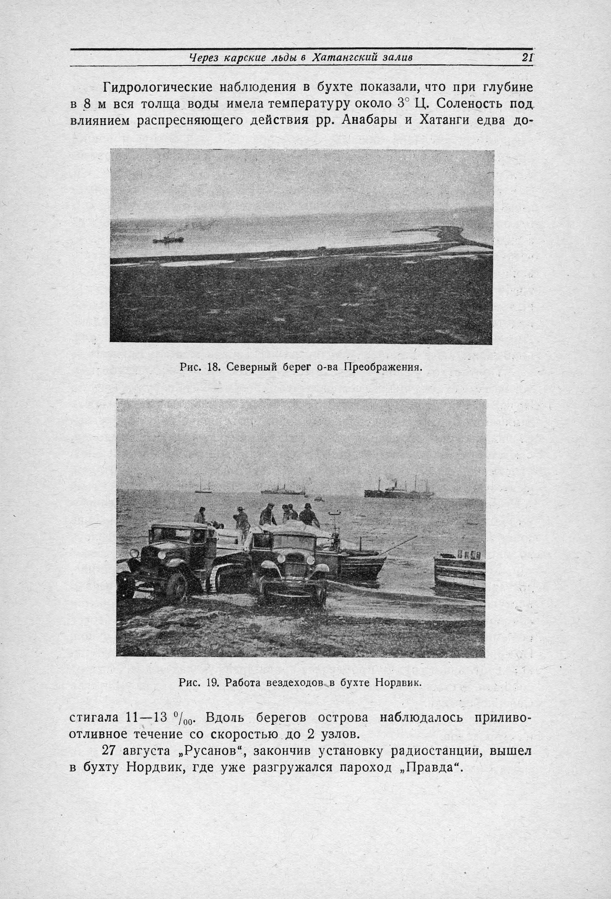 сохранилась. Гидрологические наблюдения в бухте показали, что при глубине в 8 м вся толща воды имела температуру около 3° Ц. Соленость под влиянием распресняющего действия pp. Анабары и Хатанги едва достигала 11 —13 ‰. Вдоль берегов острова наблюдалось приливо-отливное течение со скоростью до 2 узлов.