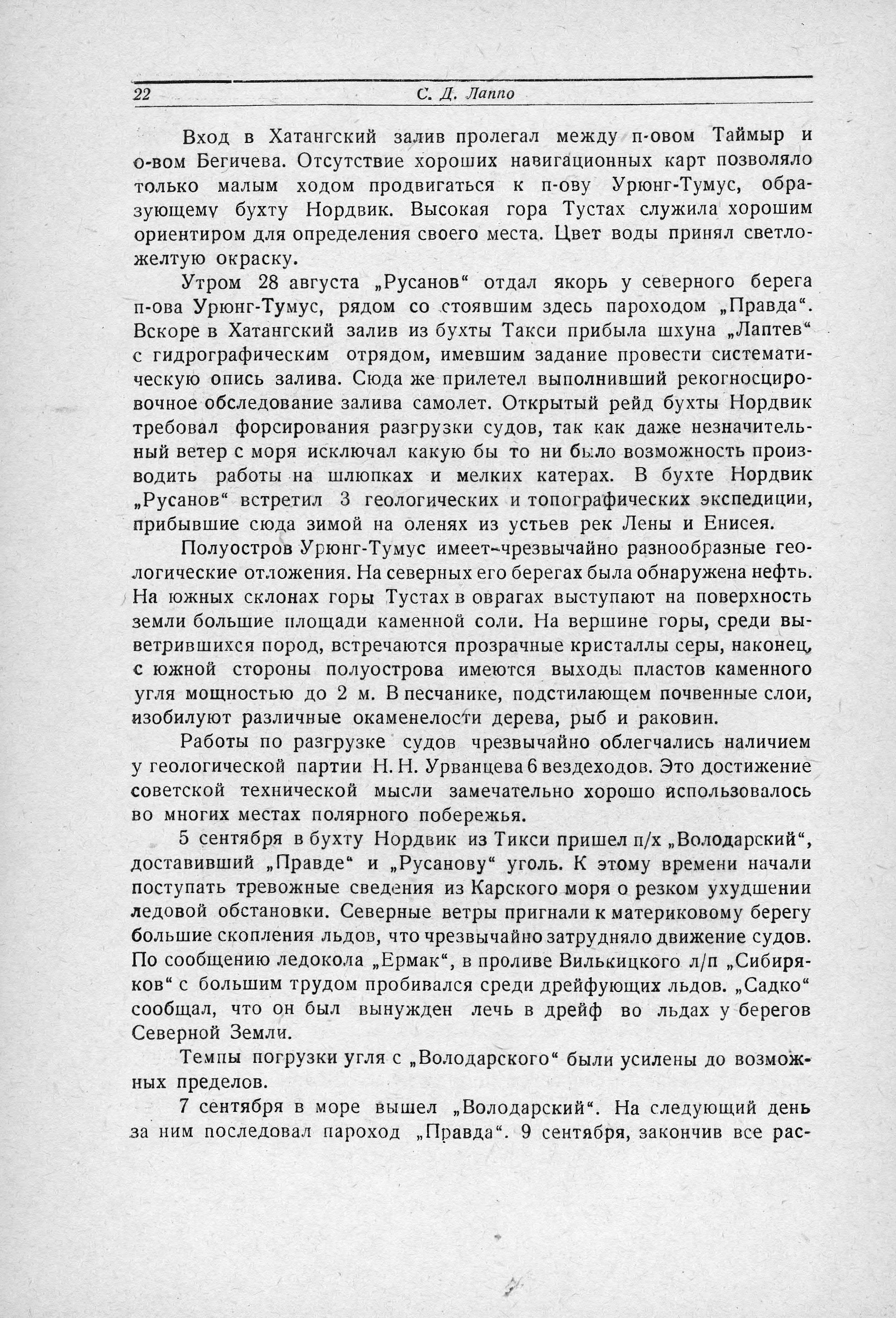 «... Погода начала портиться. Усилившиеся ветер и волнение, продолжавшиеся и в последующие дни, затрудняли выгрузку. Четвертого сентября шторм настолько усилился, что выгрузку пришлось приостановить. Штормом сорвало с якоря катер метеорологов, пришедших с мыса Пакса, и понесло в море. На катере находился моторист, чинивший мотор. Узнав о случившемся, Николай Иванович велел спустить на воду шлюпку, что было сделано не без труда, так как волнами ее то подбрасывало высоко вверх, почти до уровня палубы, то швыряло вниз. С четырьмя лучшими гребцами «Русанова», взяв с собой запасной якорь, Николай Иванович отправился на помощь мотористу. Глядя вслед удалявшейся, то взлетавшей на гребень волны, то исчезавшей в провале волн шлюпке, волнуясь за ушедших, все время, пока они не вернулись, я провела на палубе. Моторист был благополучно доставлен на «Русанов», а катер прочно поставлен на два якоря. Вечером 4 сентября в бухту Нордвик из Тикси пришел пароход «Володарский», привезший кораблям уголь. Утром 5-го он подошел и ошвартовался к борту «Русанова» для бункеровки последнего. В гости к Николаю Ивановичу пришли капитан «Володарского» Н. В. Смагин и старые друзья - соплаватели Николая Ивановича еще по экспедиции к Северной Земле в 1932 году - Н. Н. и Е. И. Урванцевы, встрече с которыми он был чрезвычайно рад...».