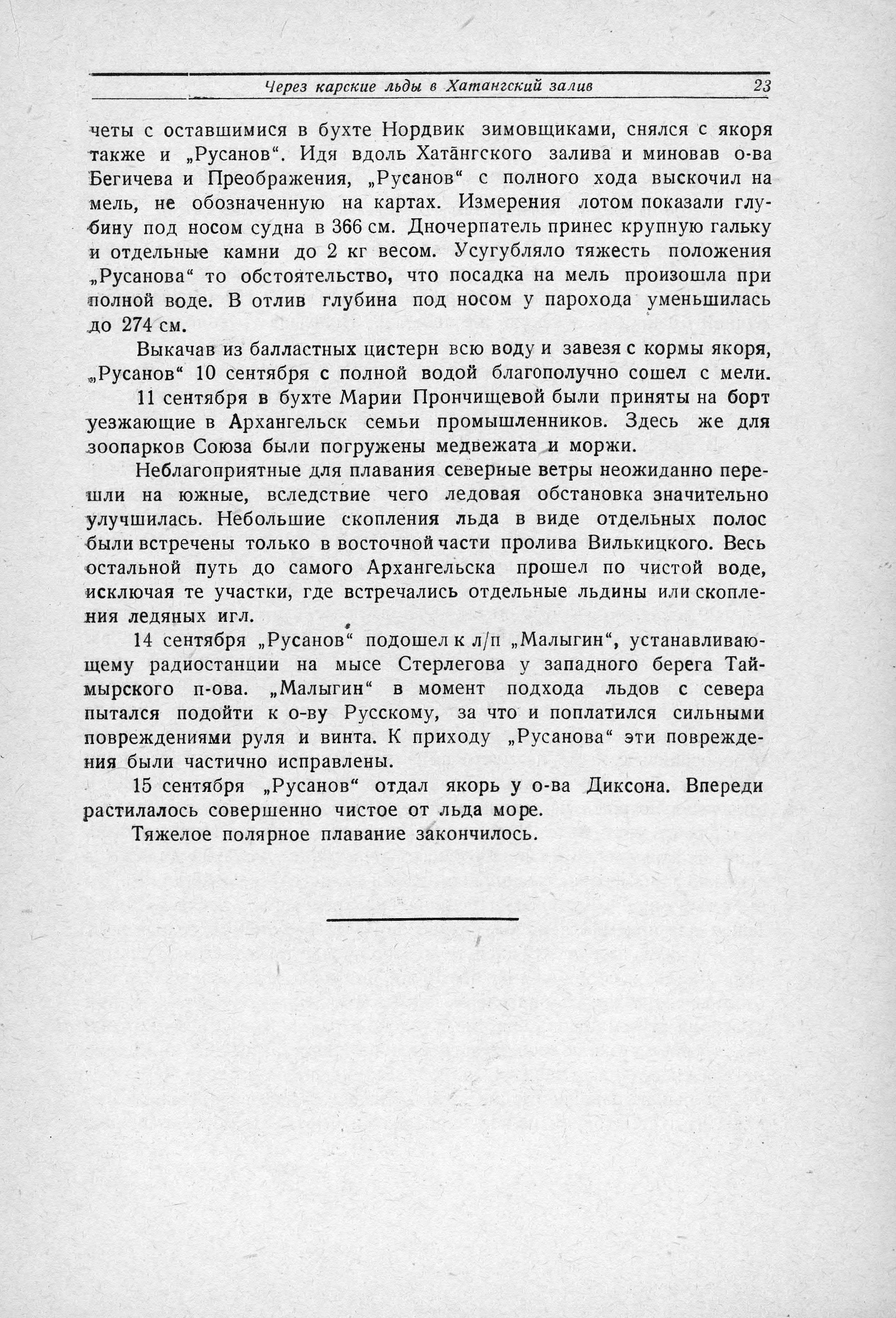 5 сентября в море вышел „Володарский". На следующий день за ним последовал пароход „Правда". 9 сентября, закончив все расчеты с оставшимися в бухте Нордвик зимовщиками, снялся с якоря также и „Русанов". Идя вдоль Хатангского залива и миновав о-ва Бегичева и Преображения, „Русанов" с полного хода выскочил на мель, не обозначенную на картах. Измерения лотом показали глубину под носом судна в 366 см. Дночерпатель принес крупную гальку и отдельные камни до 2 кг весом. Усугубляло тяжесть положения „Русанова" то обстоятельство, что посадка на мель произошла при полной воде. В отлив глубина под носом у парохода уменьшилась до 274 см. Выкачав из балластных цистерн всю воду и завезя с кормы якоря, „Русанов" 10 сентября с полной водой благополучно сошел с мели.