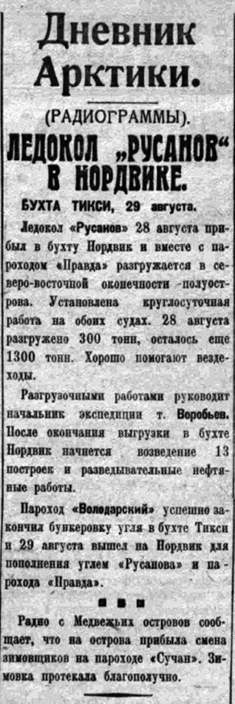 Ледокол «Русанов» 28 августа прибыл в бухту Нордвик и вместе с пароходом «Правда» разгружается в северо-восточной оконечности полуострова. Установлена круглосуточная работа на обоих судах. 28 августа разгружено 300 тонн, осталось еще 1300 тонн. Хорошо помогают вездеходы.