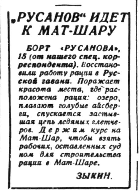 БОРТ "РУСАНОВА", 15 (от нашего спец. корреспондента). Восстановили работу рации в Русской гавани. Поражает красота места, где расположена рация: озеро, плавают голубые айсберги, спускается застывшая цепь ледяных глетчеров. Держим курс на Мат-Шар, чтобы взять рабочих, оставленных судном для строительства рации в Мат-Шаре.