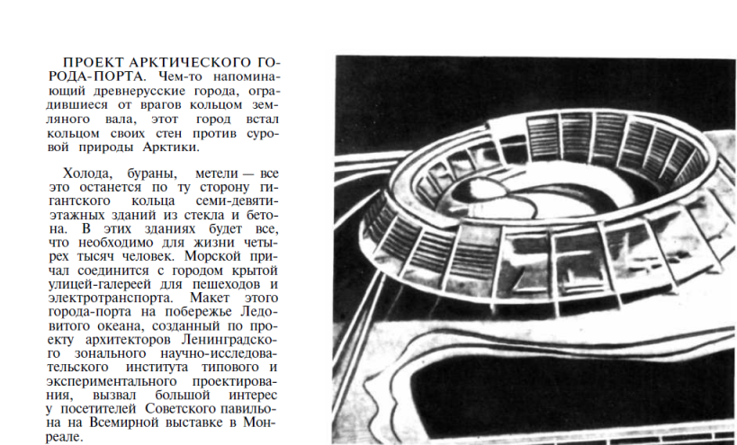 Все, о чем мы здесь рассказали, дело ближайшего будущего. Предложения таких поселков и городов с искусственным климатом для Крайнего Севера уже разрабатываются сейчас е Ленинградском филиале Академии строительства и архитектуры СССР.