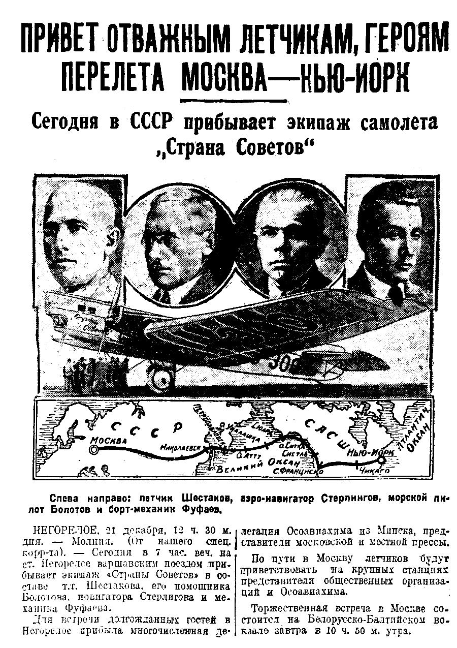 НЕГОРЕЛОЕ, 21 декабря, 12 ч. 30 м. дня. — Молния. (От нашего спец. корр-та). — Сегодня в 7 час. веч. на ст. Негорелое варшавским поездом прибывает экипаж «Страны Советов» в составе т. т. Шестакова, его помощника Болотова, навигатора Стерлигова и механика Фуфаева.
