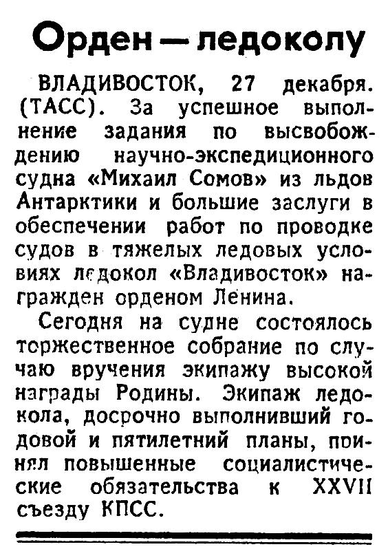 ВЛАДИВОСТОК, 27 декабря. (ТАСС). За успешное выполнение задания по высвобождению научно-экспедиционного судна «Михаил Сомов» из льдов Антарктики и большие заслуги в обеспечении работ по проводке судов в тяжелых ледовых условиях ледокол «Владивосток» награжден орденом Ленина.