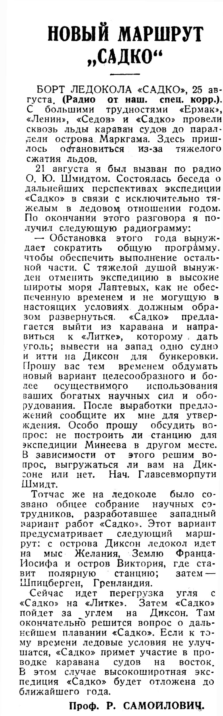 БОРТ ЛЕДОКОЛА «САДКО», 3 сентября. (Радио от наш. спец. корр.). 2 сентября «Садко» прибыл на остров Диксон для бункеровки углем. Вследствие улучшающейся ледовой обстановки Отто Юльевич Шмидт освободил «Садко» от проводки каравана судов. Однако позднее время года и ледовые условия не позволяют «Садко» работать в высоких широтах моря Лаптевых. Поэтому приступаем к выполнению западного варианта, который предусматривает маршрут с о. Диксон на мыс Желания, затем к Земле Франца-Иосифа и острову Виктория, где должна быть поставлена полярная станция, и, наконец, к Шпицбергену и Гренландии.