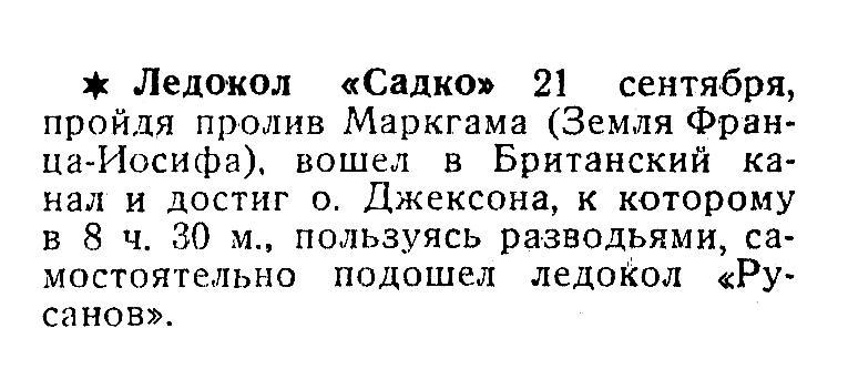 Ледокол «Садко» 21 сентября, пройдя пролив Маркгама (Земля Франца-Иосифа), вошел в Британский канал и достиг о. Джексона, к которому в 8 ч. 30 м., пользуясь разводьями, самостоятельно подошел ледокол «Русанов».