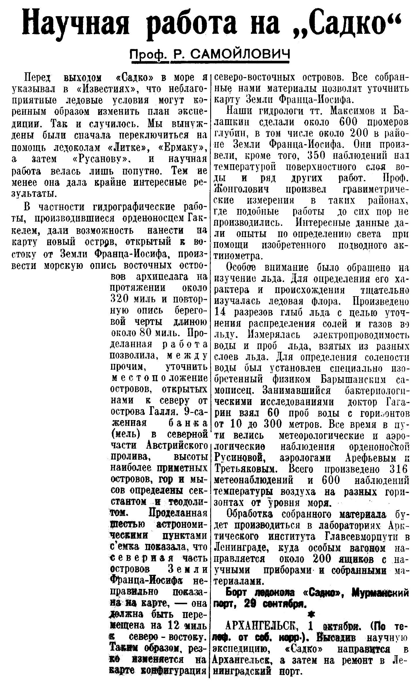 Перед выходом «Садко» в море я указывал в «Известиях», что неблагоприятные ледовые условия могут коренным образом изменить план экспедиции. Так и случилось. Мы вынуждены были сначала переключиться на помощь ледоколам «Литке», «Ермаку», а затем «Русанову». и научная работа велась лишь попутно. Тем не менее она дала крайне интересные результаты.