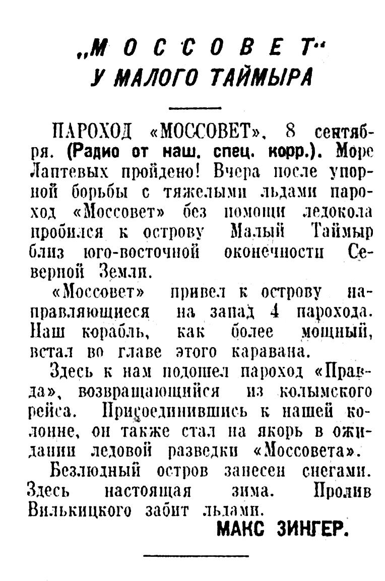 Радио от наш. спец. корр.). У берегов Северной Земли в ледовом плену оказался караван судов, возглавляемый ледоколом «Литке». От ледокола и парохода «Моссовет» к остальным кораблям протянулись в торосах извилистые тропинки. Их проложили моряки, приходящие на эти суда за продовольствием и углем. Целыми днями движутся по тропинкам люди с мешками. Судовые плотники ладят грузовые нарты. Жаль, что у нас нет собак, — Они бы значительно облегчили переброску грузов. Идет проверка палаток. Флаг-радист орденоносец