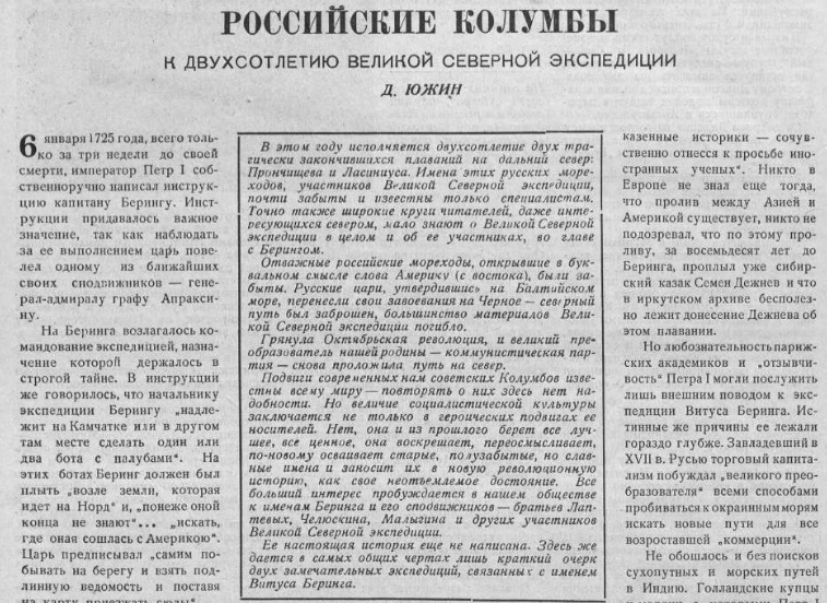 В последние годы своей жизни Петр I активно занимался разработкой планов освоения северных и восточных земель и поисков морских путей в Америку и Индию. В январе 1725 года, уже будучи тяжело больным, он составил инструкцию по подготовке «Сибирской экспедиции», которая предписывала дойти по северным морям до Америки, исследовать те берега и нанести их на карту. Начальником экспедиции был назначен датчанин Витус Беринг, который неоднократно пытался дойти до берегов Америки, но не смог пересечь пролив, названный впоследствии его именем, и вернулся в 1730 г. в Петербург. Там он представил правительству Анны Иоанновны доклад о своих плаваниях и выдвинул проект новых исследований, указав на необходимость «выведывать северные земли или берега Сибири» с целью установления торговых маршрутов в Северо-Западную Америку и Японию.