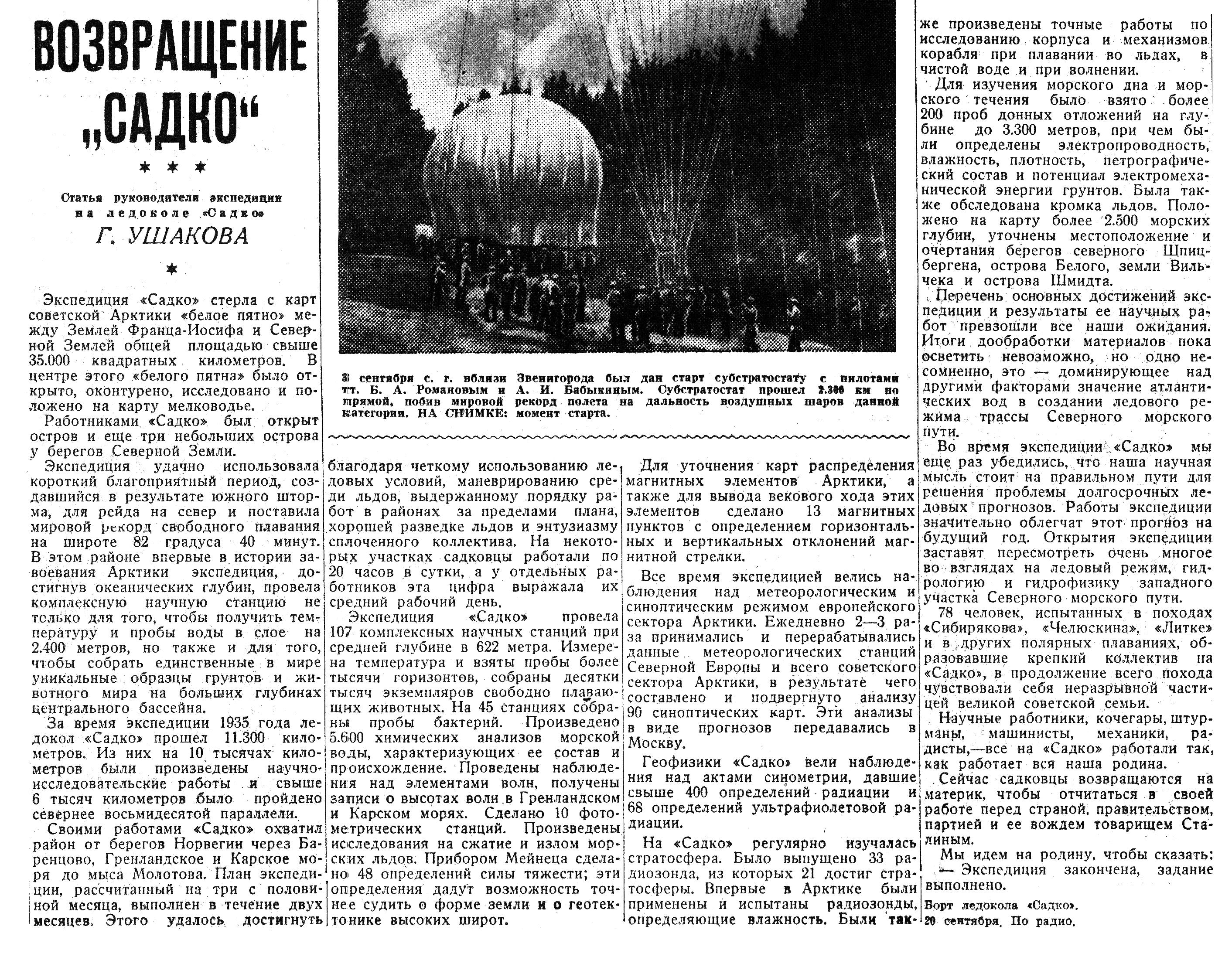 Статья начальника экспедиции на „Садко“ Г. УШАКОВА