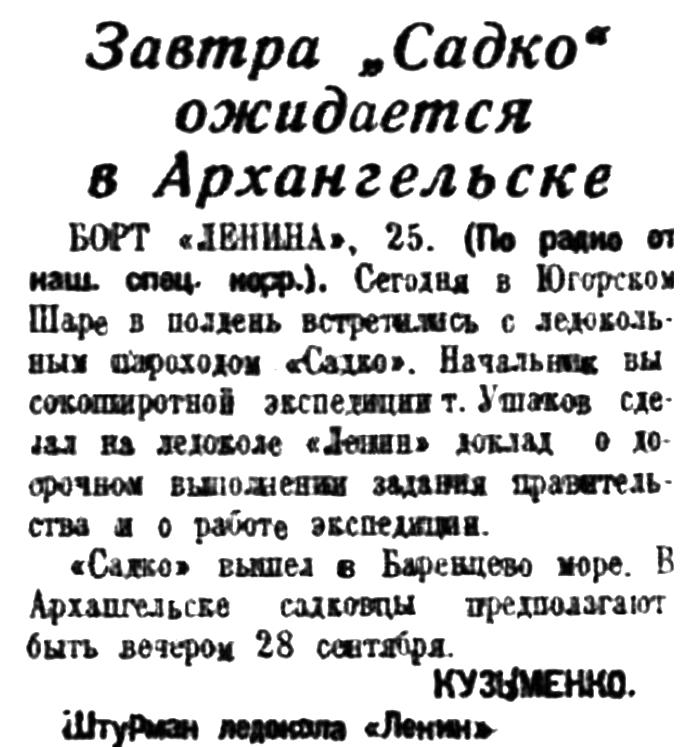 БОРТ «ЛЕНИНА», 25. (По радио от наш. спец. корр.). Сегодня в Югорском Шаре в полдень встретились с ледокольным пароходом «Садко». Начальник высокоширотной экспедиции т. Ушаков сделал на ледоколе «Ленин» доклад о досрочном выполнении задания правительства и о работе экспедиции.