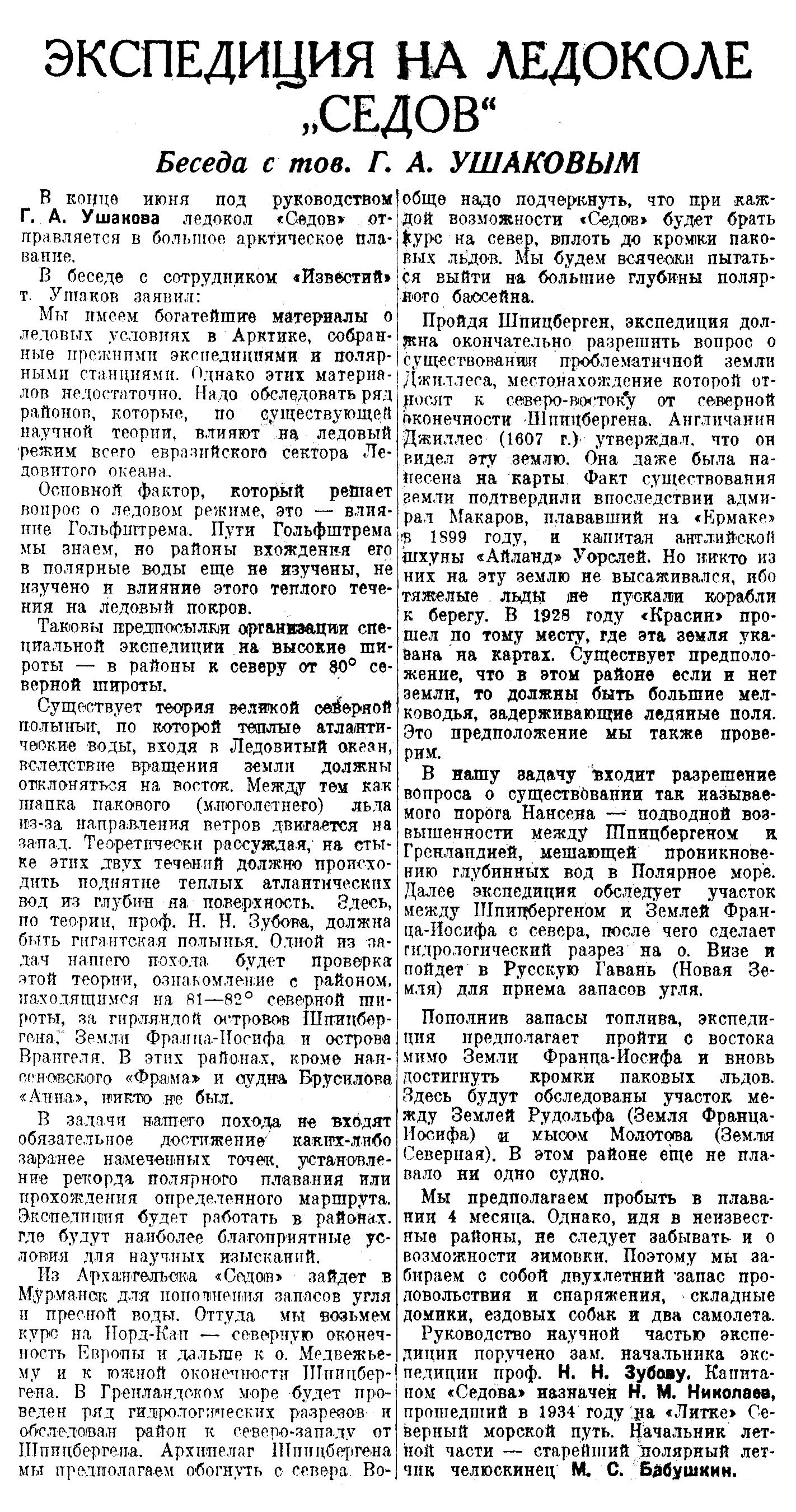 В беседе с сотрудником ТАСС зам. нач. Главсевморпути Ушаков, назначенный начальником экспедиции, сообщил следующее: