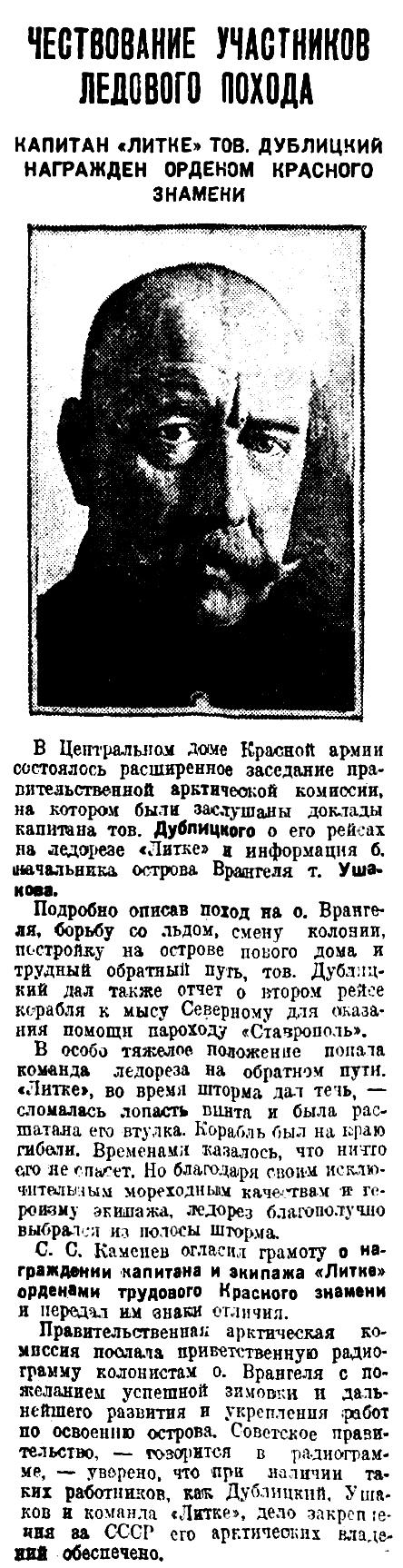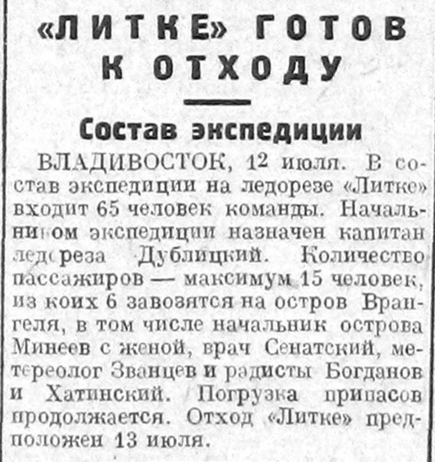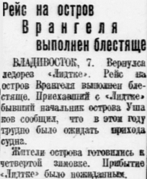 В предстоящей впоследствии экспедиции «Лидтке» к острову Врангеля примут участие корреспонденты центральной прессы и кинооператоры. Несомненно, что их участие даст возможность широко осветить жизнь наших богатейших северо-восточных окраин Азии, с которыми широкий читатель почти незнаком.