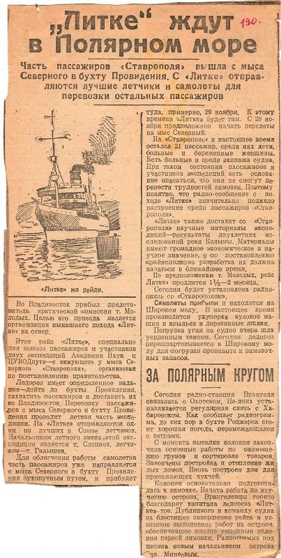 Что касается посылки к о. Врангеля ледореза «Лидтке», то это является наиболее реальным и правильным решением, и, помимо всего, появление в наших арктических дальневосточных водах мощного ледореза вообще принесет огромную помощь подъему благосостояния и производительных сил нашей чрезвычайно богатой Северной Азии.