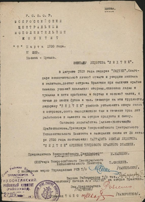 По поводу возможности организации санной экспедиции на о. Врангеля отправлен также по радио запрос на пароход «Ставрополь», тов. Г. Д. Красинскому, наиболее близко изучившему арктическую область в районе о. Врангеля. Сейчас «Ставрополь» находится на пути во Владивосток.