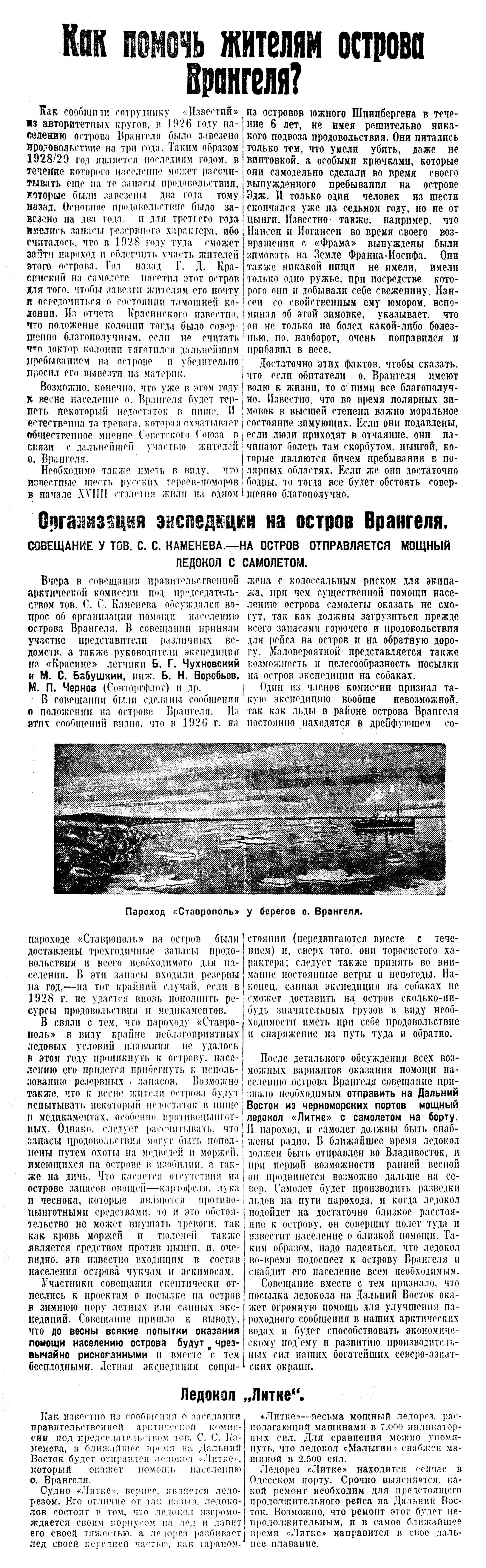 По поводу возможности организации санной экспедиции на о. Врангеля отправлен также по радио запрос на пароход «Ставрополь», тов. Г. Д. Красинскому, наиболее близко изучившему арктическую область в районе о. Врангеля. Сейчас «Ставрополь» находится на пути во Владивосток.