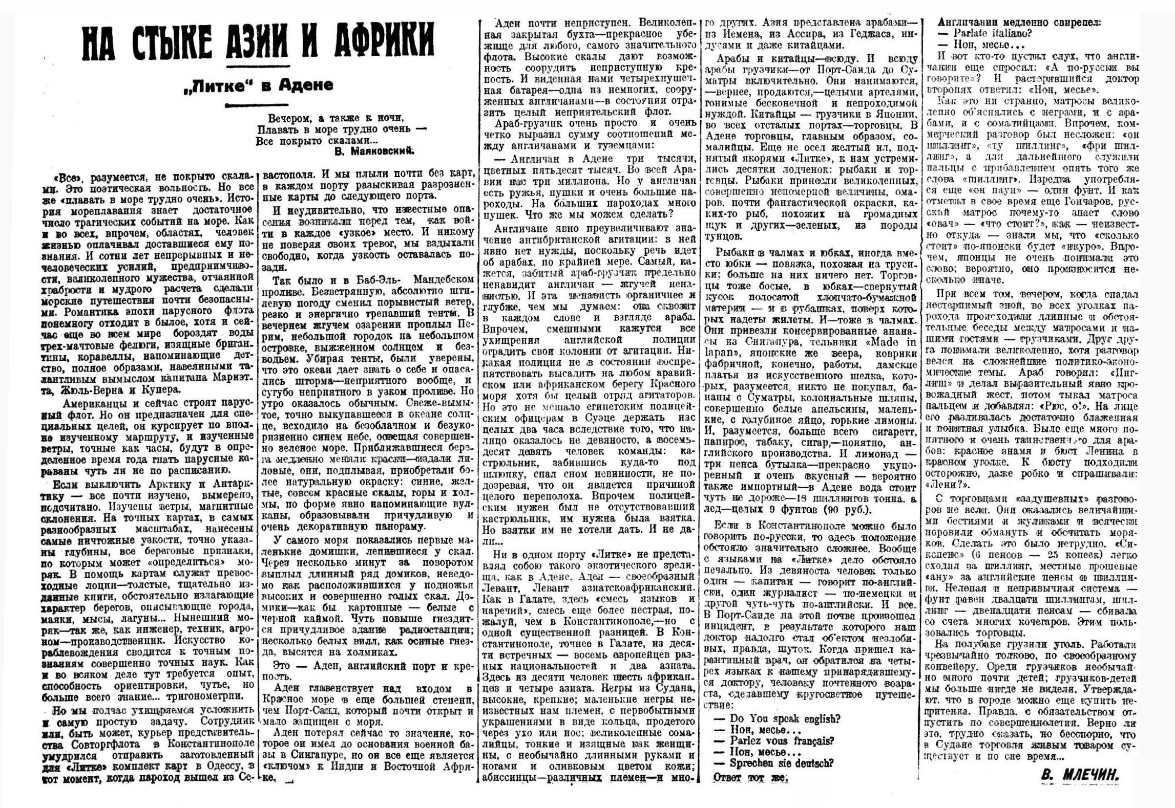 Последняя корреспонденция с ледореза пришла 5 июня: накануне «Литке» бросил якорь во Владивостоке. Видимо, Млечину пришлось сойти на берег (причины нам неизвестны). Потом в «Вечерке» вышло три его очерка (25 июня, 4 и 19 июля) о путешествии: о штиле и качке, матросских байках, корабельных обезьянках, пальмах… В очерке от 25 июня рассказывается, как на борту отмечали 1 Мая посреди Красного моря — это было «вероятно, единственное в этих широтах легальное рабочее собрание с таким количеством участников». Участники собрания были в трусах, а то и набедренных повязках из полотенец. «Только один кочегар остряк, торжественности для, повязался галстуком. Больше на нем, к сожалению, ничего не было». В 1929 году шутить про такое еще не считалось кощунством — не то что в более поздние времена.