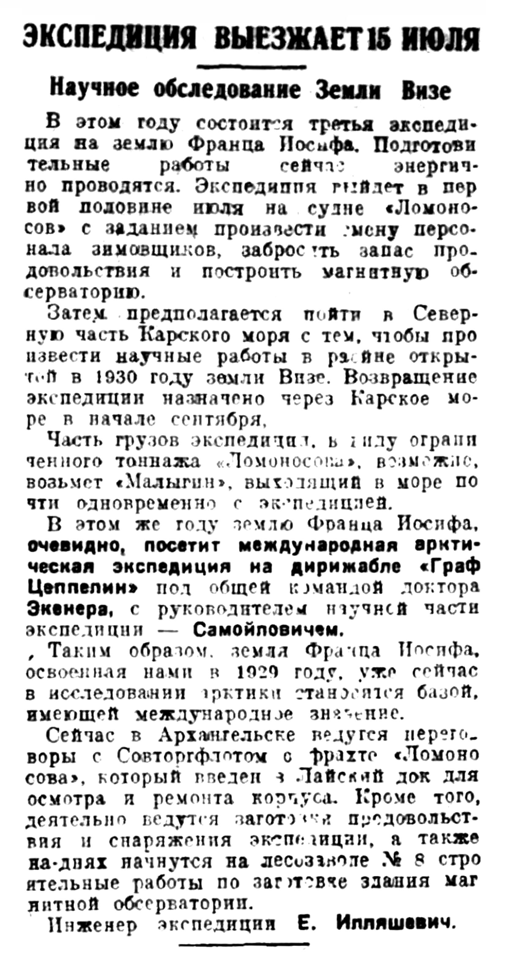 Третья полярная экспедиция на землю Франца-Иосифа, организованная Арктическим институтом, вышла из Архангельска на паруснопаровом судне „Ломоносов" 19 июля. На борту „Ломоносова", помимо участников экспедиции и третьей смены зимовщиков, находились еще участники Новоземельской экспедиции Арктического института и экспедиции Всесоюзного объединения Гражданского воздушного флота, моторный бот которой „Аэроарктика" буксировался п/с „Ломоносов" до Новой Земли. В задачи последней экспедиции входило обследование аэродромов для предстоящих полетов в Арктике.
