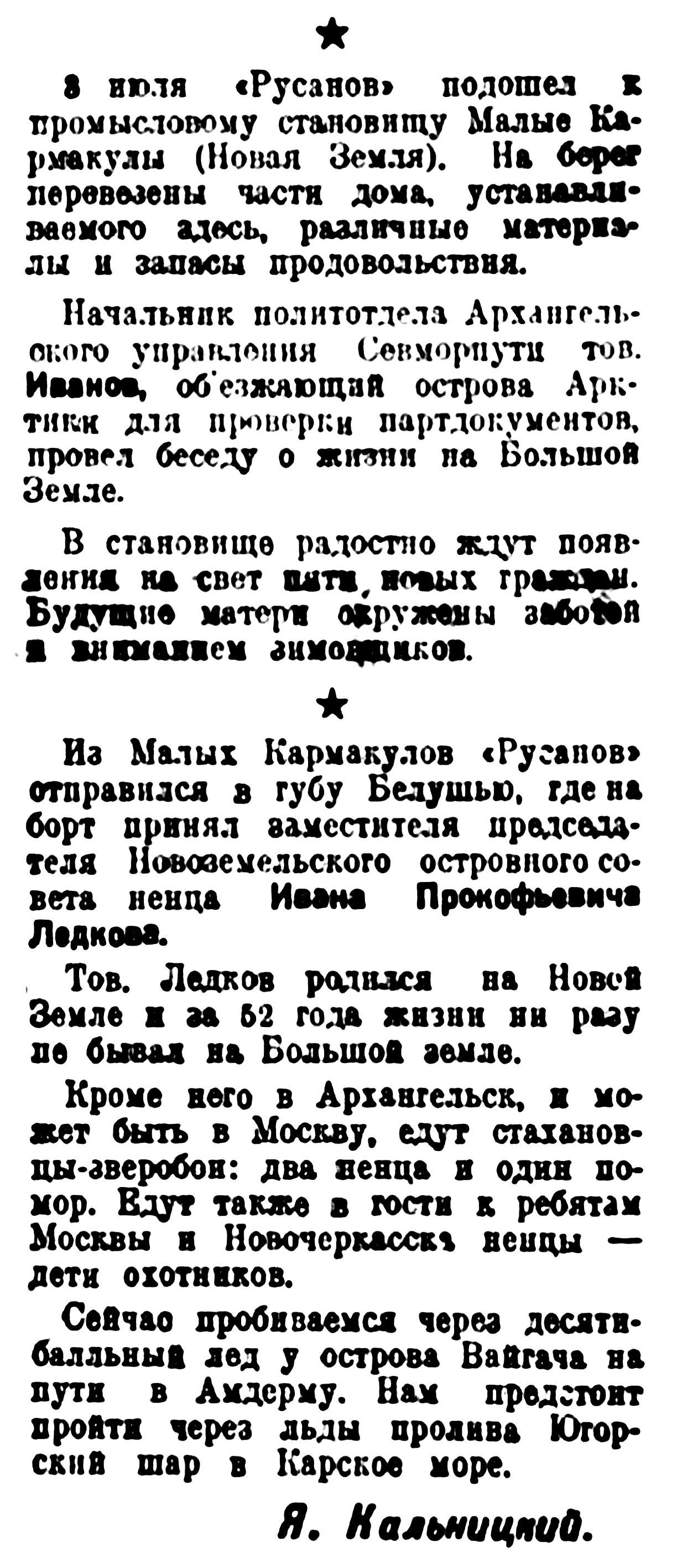Правда Севера, 1936, № 153, 5 июля."РУСАНОВ" ИДЕТ В КАРСКОЕ МОРЕ
