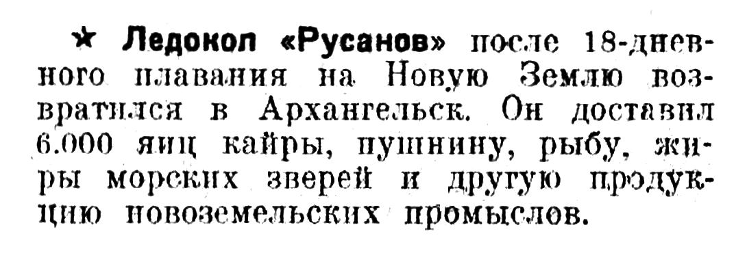 Ледокол «Русанов» после 18-дневного плавания на Новую Землю возвратился в Архангельск. Он доставил 6.000 яиц кайры, пушнину, рыбу, жиры морских зверей и другую продукцию новоземельских промыслов.