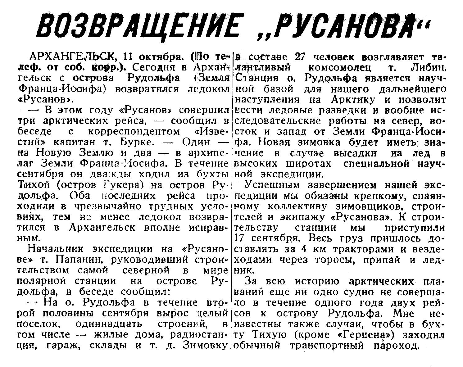 Ледокол «Русанов» после 18-дневного плавания на Новую Землю возвратился в Архангельск. Он доставил 6.000 яиц кайры, пушнину, рыбу, жиры морских зверей и другую продукцию новоземельских промыслов.