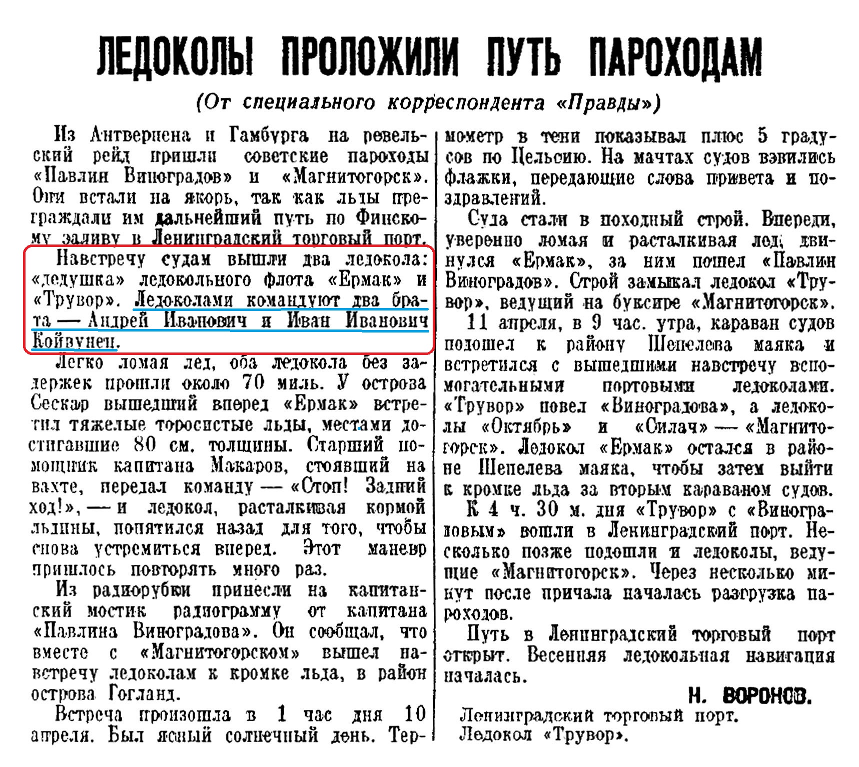 Спец. корр. «Правды»). Ледоколы «Ермак» и «Трувор», вышедшие для проводки в Ленинград первых в текущую навигацию пароходов «Магнитогорск» и «Виноградов», идущих из-за границы, встретили их сегодня в 13 часов в районе острова Гогланда.