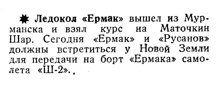 «Ермак». Весь путь от Ленинграда до Мурманска он пройдет в 9—10 суток. В Мурманске он дополнительно нагрузится водой и углем и пойдет на тюлений промысел. На борту «Седова» находятся и научные специалисты. Свыше 90 миль «Седову» придется пройти во льдах Финского залива.