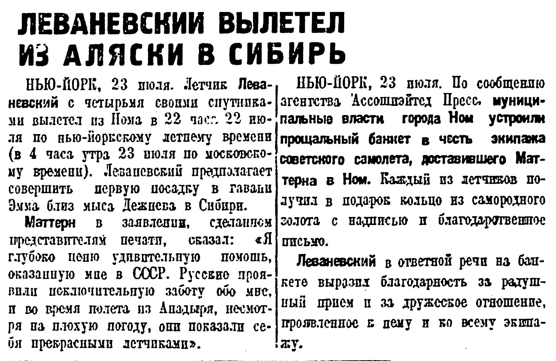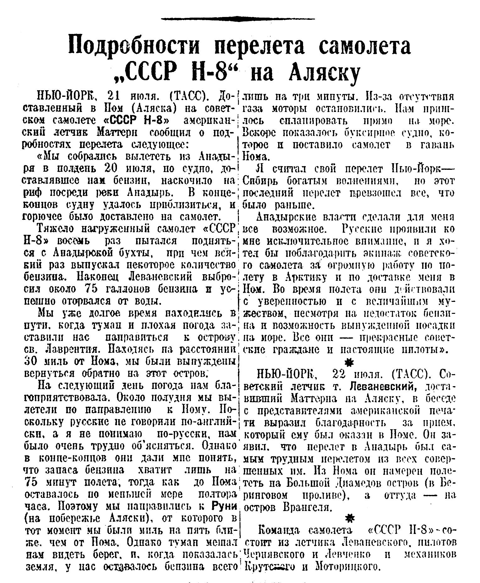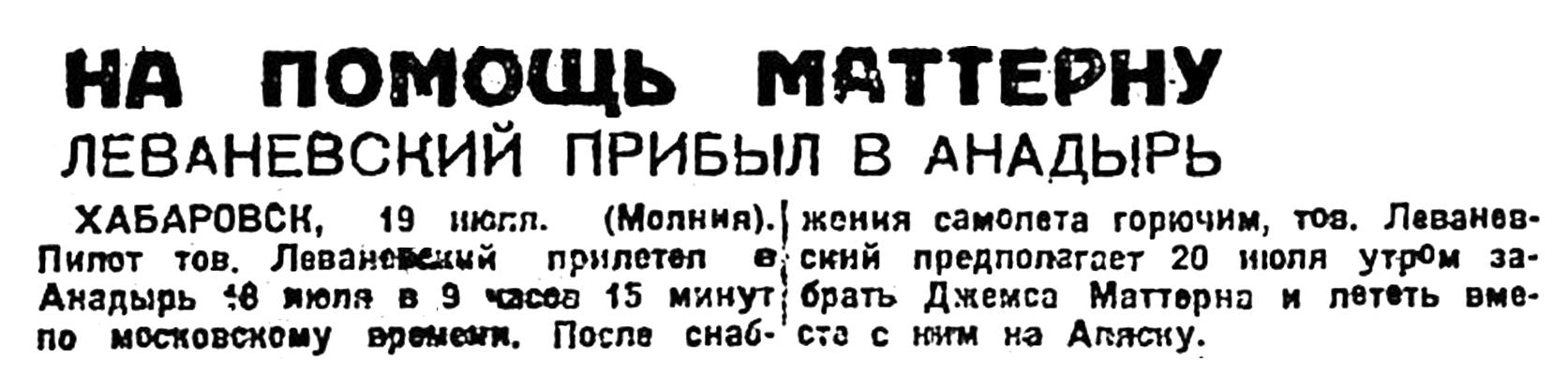 ХАБАРОВСК, 19 июля. (Молния). Пилот тов. Леваневский прилетел в Анадырь 18 июля в 9 часов 15 минут по московскому времени. После снабжения самолета горючим, тов. Леваневский предполагает 20 июля утром забрать Джемса Маттерна и лететь вместо с ним на Аляску.