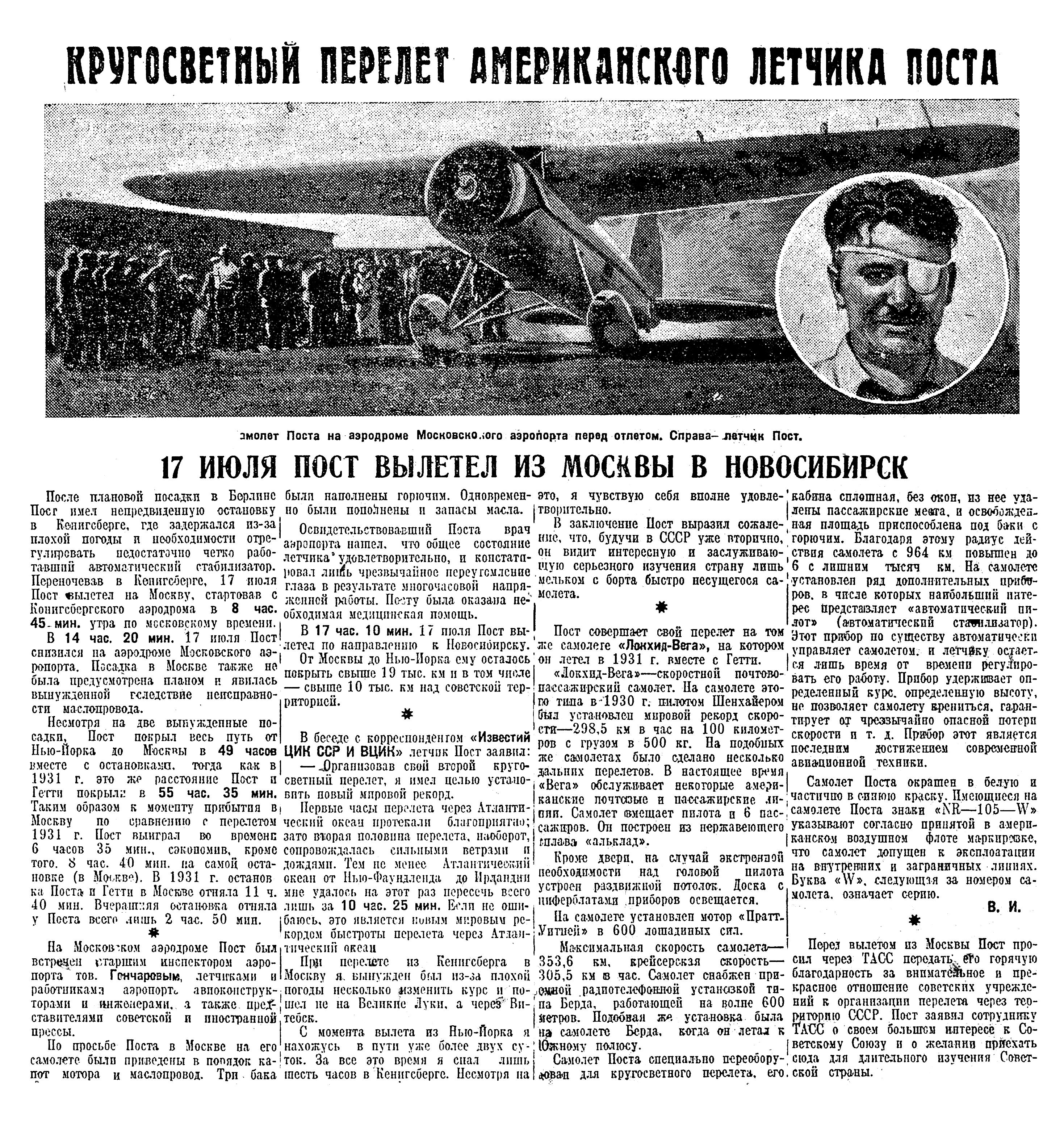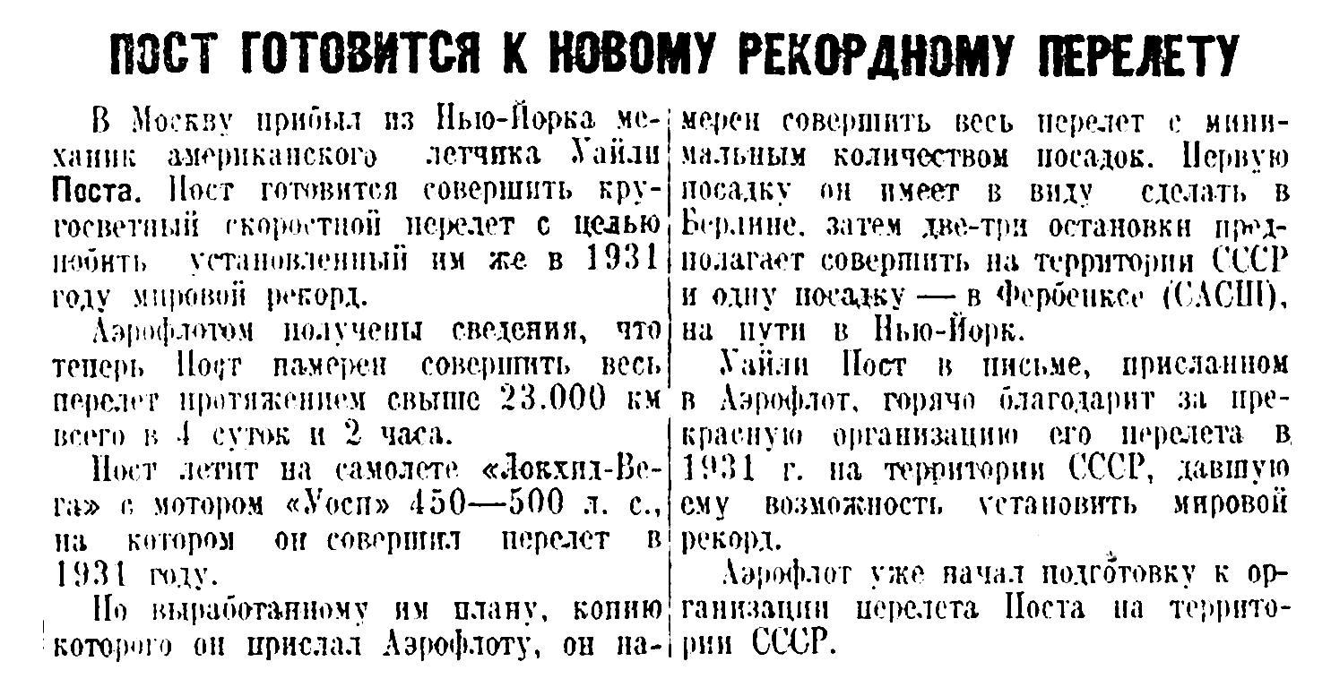 Американский летчик Пост — рекордсмен кругосветного перелета — готов к вторичному перелету по маршруту Маттерна: Нью-йорк — Берлин — Москва — Новосибирск — Иркутск — Хабаровск — Аляска — Нью-Йорк. Пост решил побить собственный рекорд поставленный им в 1931 году совместно с Гатти. Первый перелет был совершен ими за 8 суток 15 час. Сейчас Пост предполагает окончить кругосветный перелет в 4 суток 2 часа.