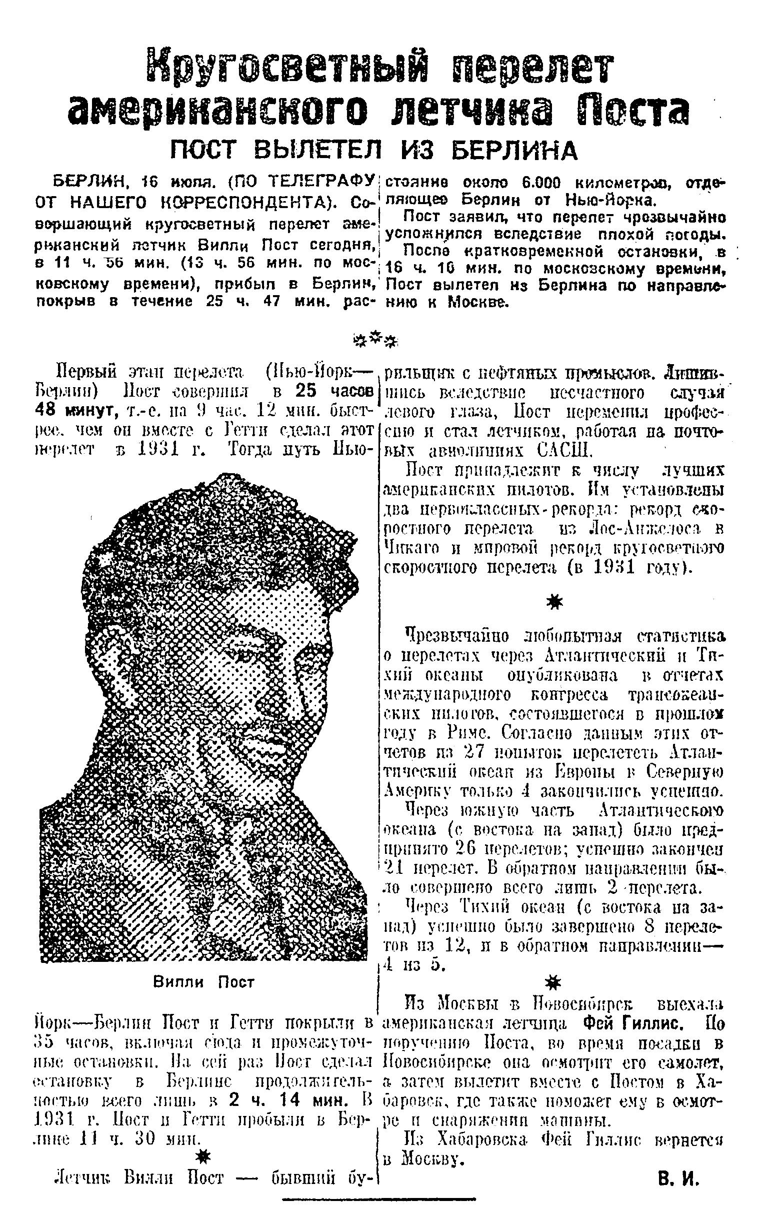 По полученным в Москве сведениям, американский летчик Пост, вылетевший 15 июля из Нью-Йорка в кругосветный перелет, опустился на Берлинском аэродроме 16 июля в 1 ч. 50 мин. дня.