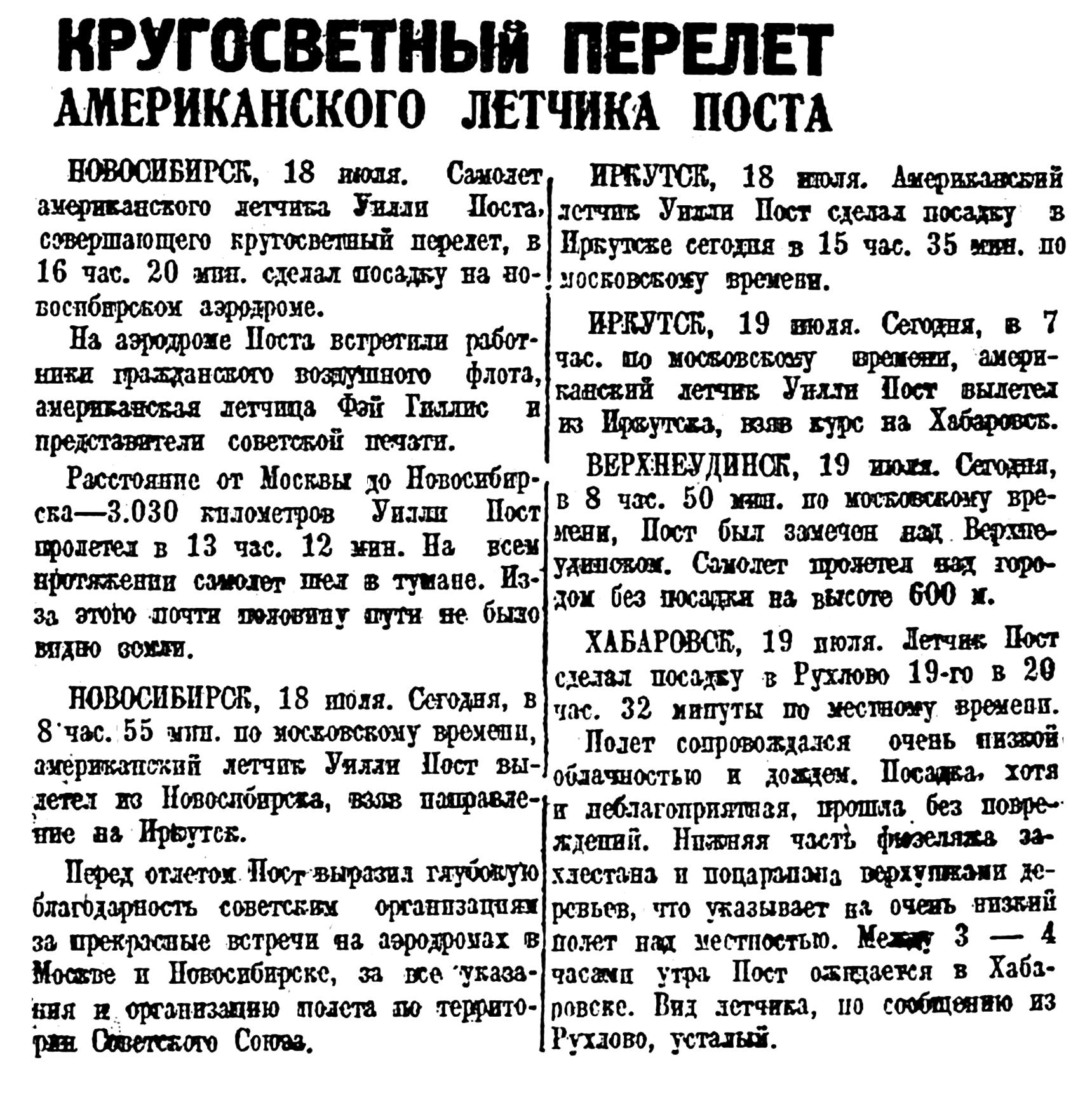 Вопреки своим прежним планам. Пост вылетел из Новосибирска один. Летчица Фэй Гиллис осталась в Новосибирске, откуда, проследив за полетом Поста до Хабаровска, вернется обратно в Москву.