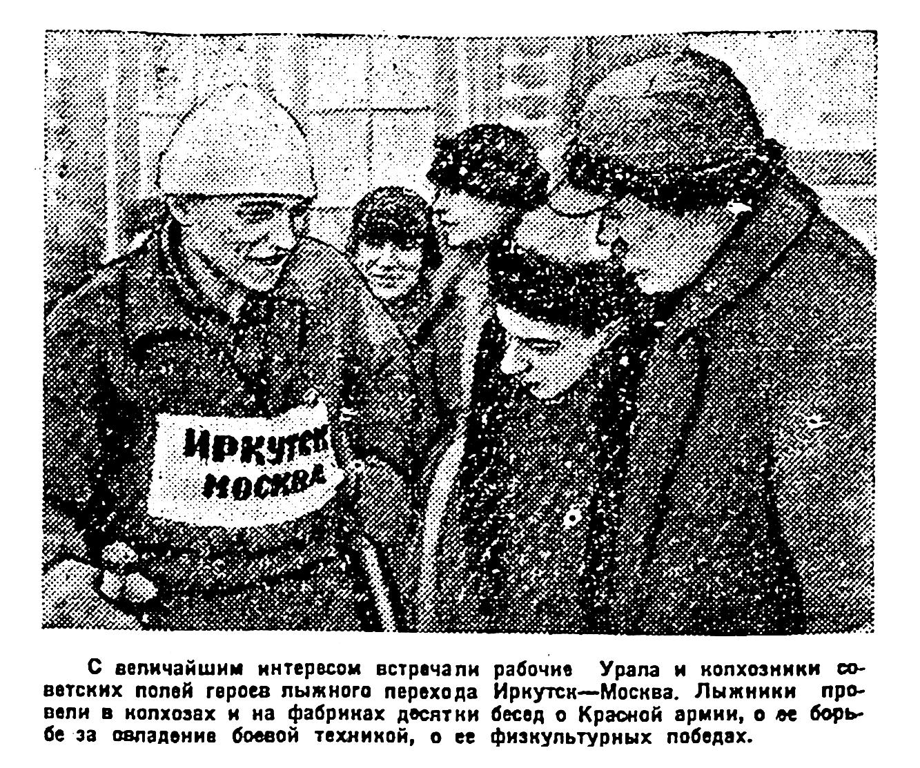 С величайшим интересом встречали рабочие Урала и колхозники советских полей героев лыжного перехода Иркутск-Москва. Лыжники провели в колхозах и на фабриках десятки бесед о Красной армии, о ее борьбе за овладение боевой техникой, о ее физкультурных победах.