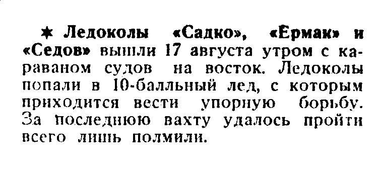 ♦ Ледоколы «Садко», «Ермак» и «Седов» вышли 17 августа утром с караваном судов на восток. Ледоколы попали в 10-балльный лед, с которым приходится вести упорную борьбу. За последнюю вахту удалось пройти всего лишь полмили.
